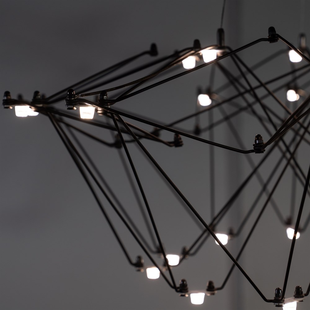 Оригинальная дизайнерская люстра Sia удивляет сложной и вместе с тем гармоничной конструкций. Прямые линии каркаса из тонких прутков нержавеющей стали складываются в многогранники, которые образуют окружность. Если приглядеться, можно заметить отдаленное сходство с классическими подвесными светильниками эпохи рококо. Но люстра Sia сморится очень современно и подходит для оформления помещений в стилистике минимализма и хайтека. Светодиодная подсветка подчеркивает очертания светильника и создает комфортное общее освещение.