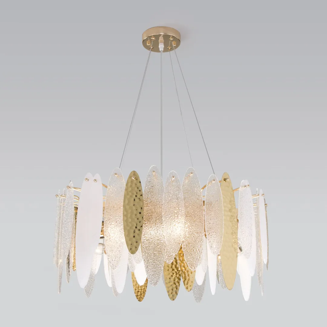 Люстра украшена эффектным декором из фактурного стекла. Арматура цвета золото, изготовлена из высококачественного металла с надежным защитным покрытием.