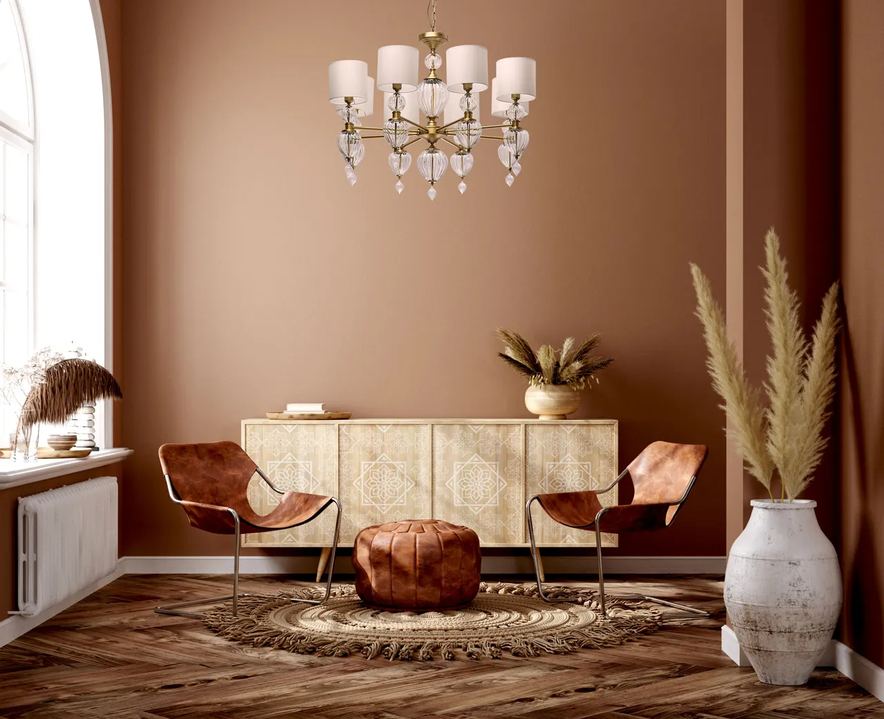 Основание светильника выполнено из металла и гальванизировано в цвет латуни. Светильник декорирован выдувным стеклом ручной работы. Текстильные абажуры белого цвета с термостойким акрилом внутри, отделаны кантом и прошиты.
