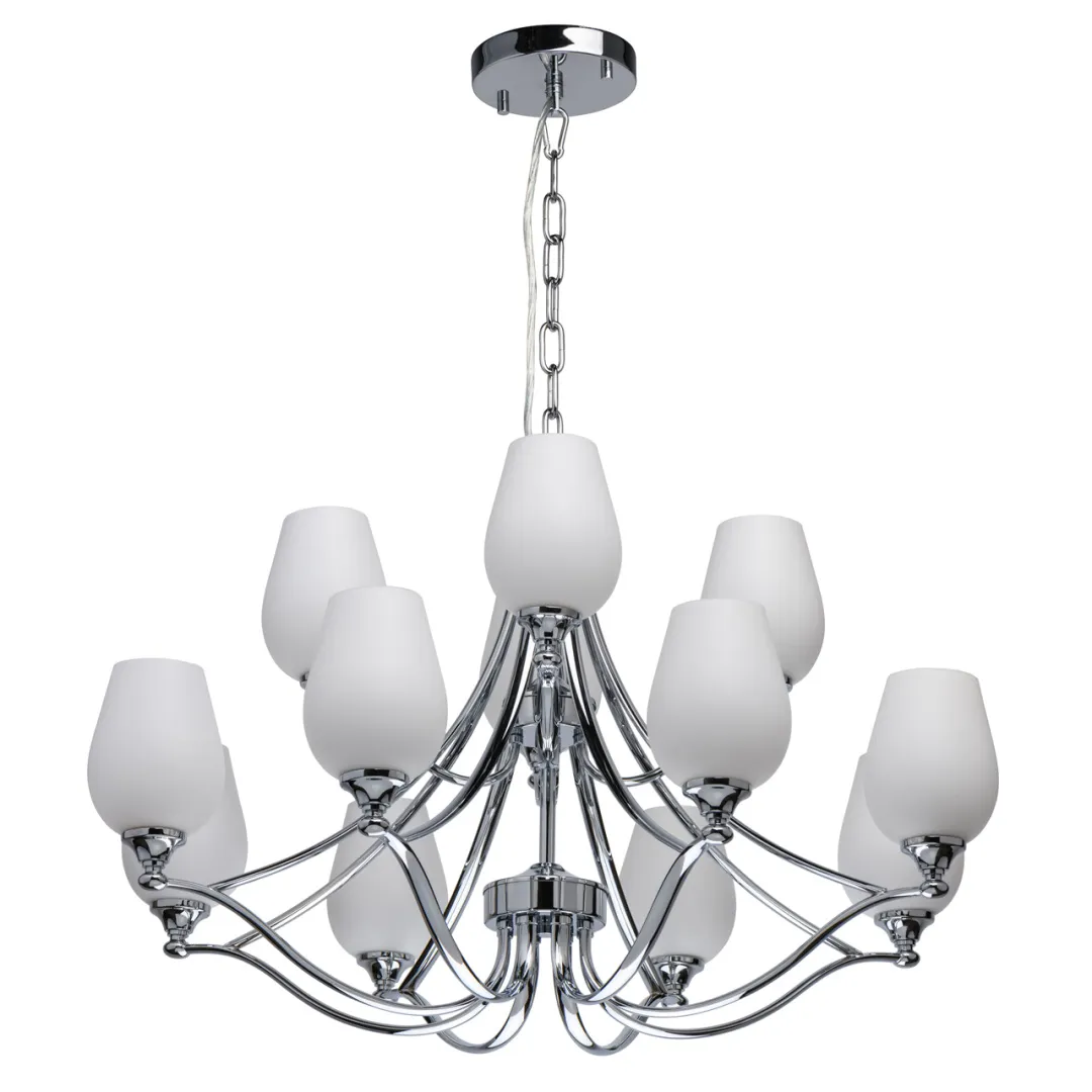 Основание светильника выполнено из металла и гальванизировано в цвет блестящего хрома. Плафоны из опалового стекла выдуваются в форму и обработаны по технологии травления.