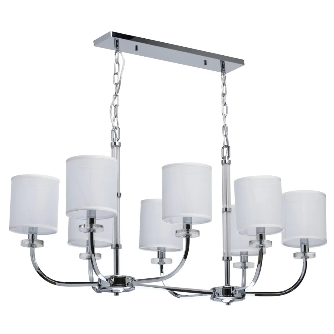 Основание светильника выполнено из металла и гальванизировано в цвет блестящего хрома. Абажуры с термостойким акрилом внутри и текстилем с рисовым рисунком белого цвета снаружи. Абажуры отделаны кантом и прошиты. Светильник декорирован прозрачным массивом хрусталя.