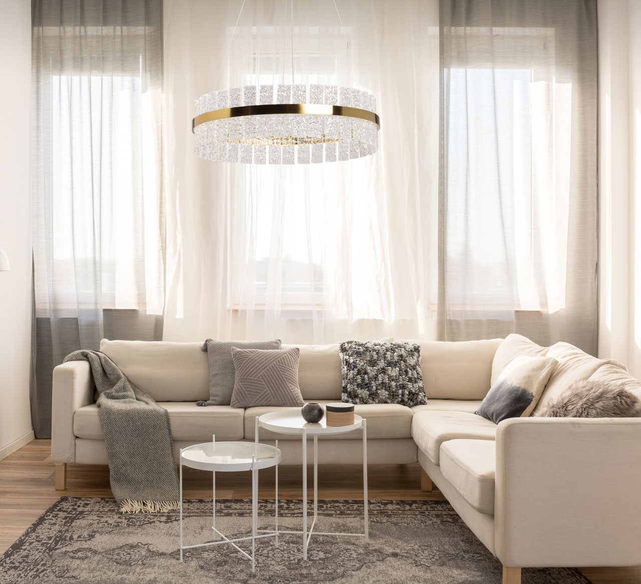 Металлическое основание светильника гальванизировано в цвет латуни. Люстра декорирована пластинами из полупрозрачного фактурного стекла.