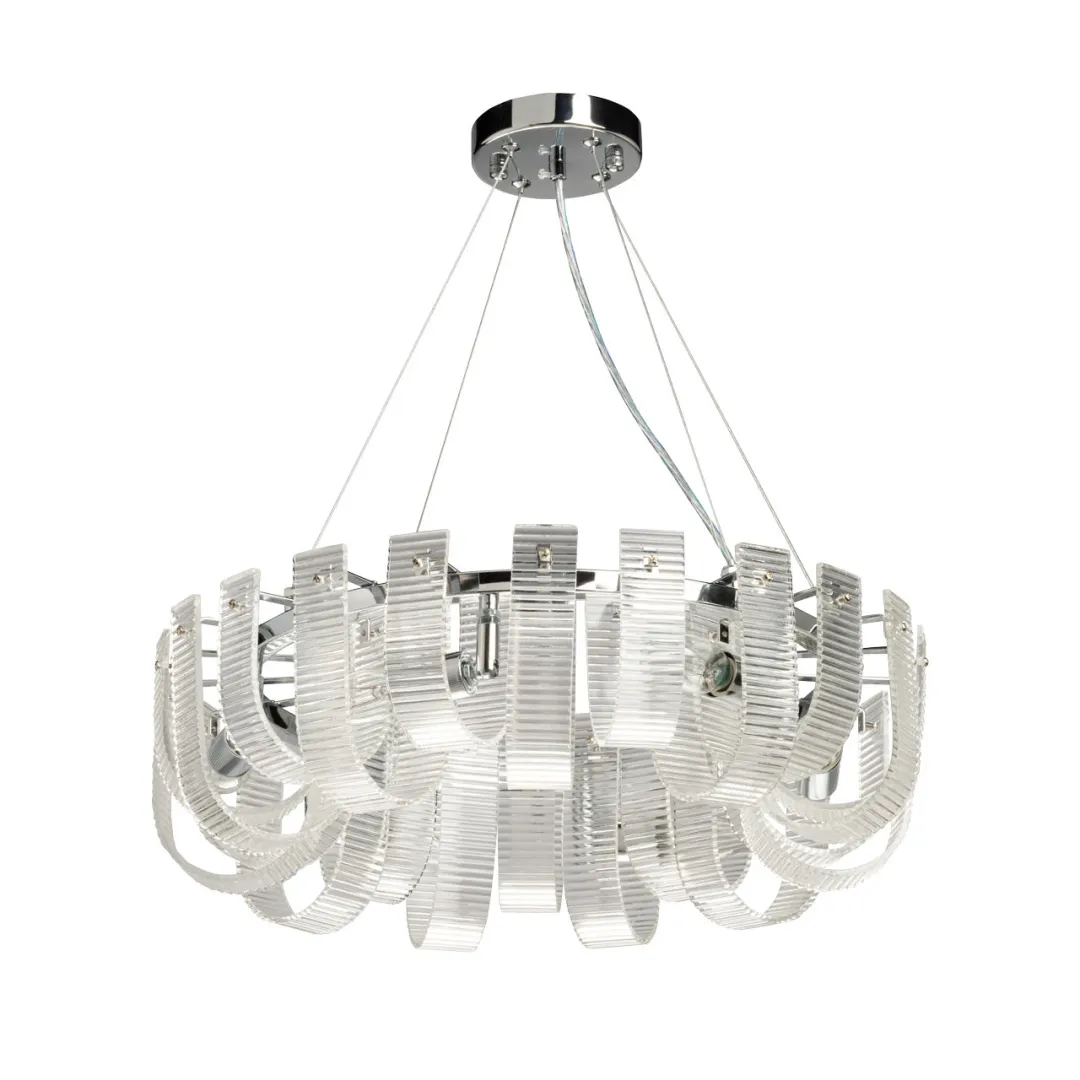 Металлическое основание люстры гальванизировано в цвет хрома. Плафон выполнен из прозрачного фактурного стекла.