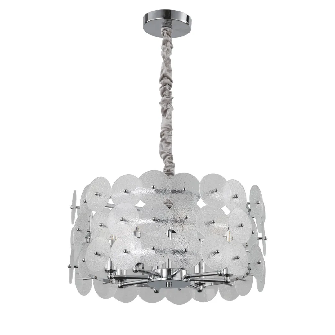 Металлическое основание подвесной люстры гальванизировано в цвет хрома. Люстра декорирована пластинами из фактурного полупрозрачного стекла.