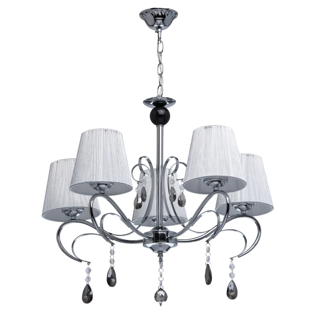 Основание светильника выполнено из металла и гальванизировано в цвет хрома. Рожки и декоративные элементы изящно изогнуты по технологии проката на роликовом станке. Центральный стержень светильника декорирован массивом из хрустального стекла, окрашенного в массе в черный цвет. Абажуры: выполнены из текстильных нитей стального цвета с термостойким акрилом внутри.Декор: подвески из прозрачного и гальванизированного в цвет антрацит декоративного стекла.