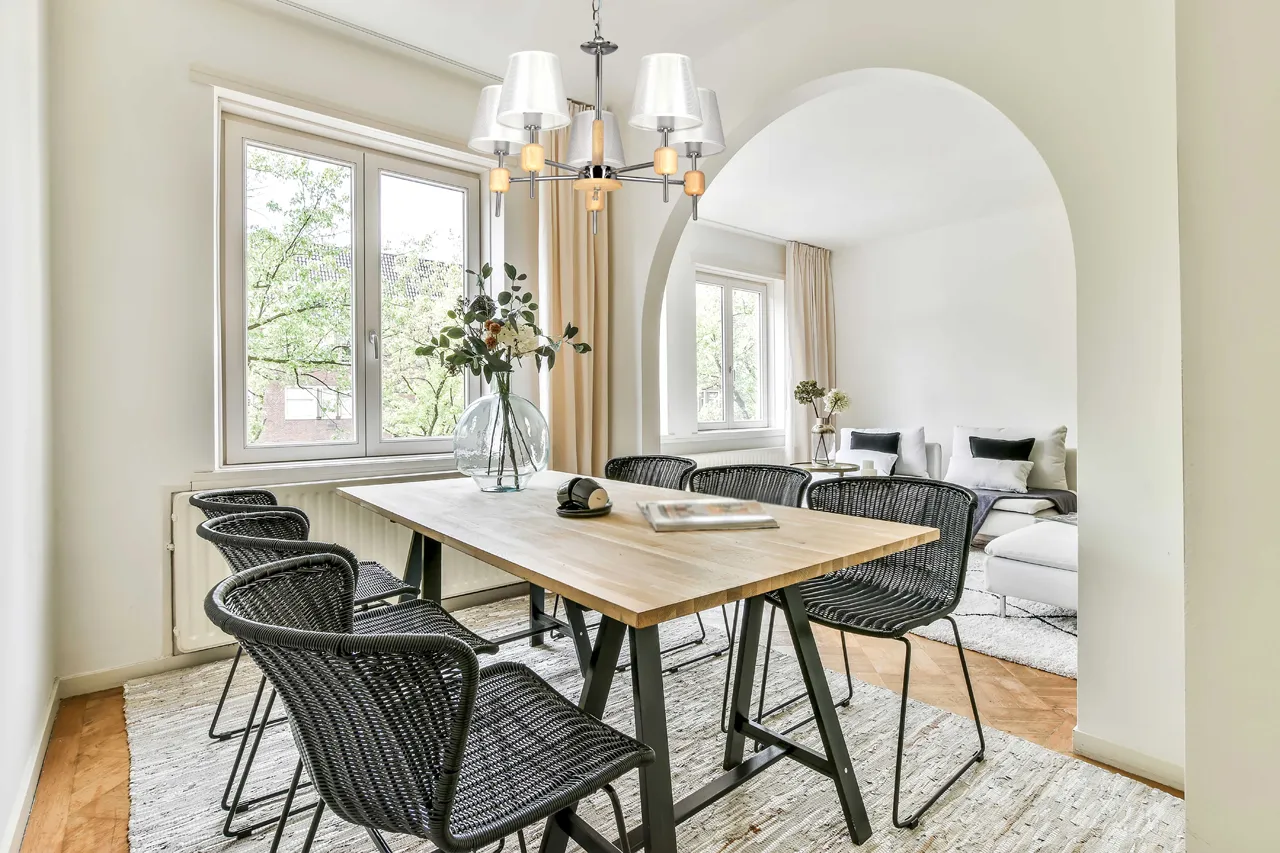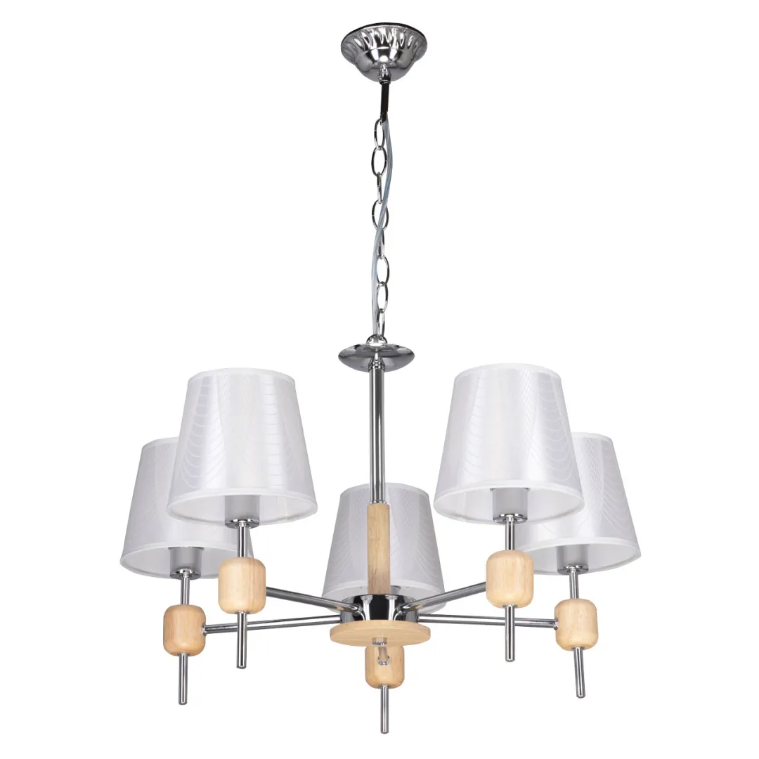 Металлическое основание светильника гальванизировано в цвет хрома. Светильник декорирован текстильными абажурами белого цвета с термостойким акрилом внутри. Подвесная люстра декорирована элементами из массива дерева натурального цвета.