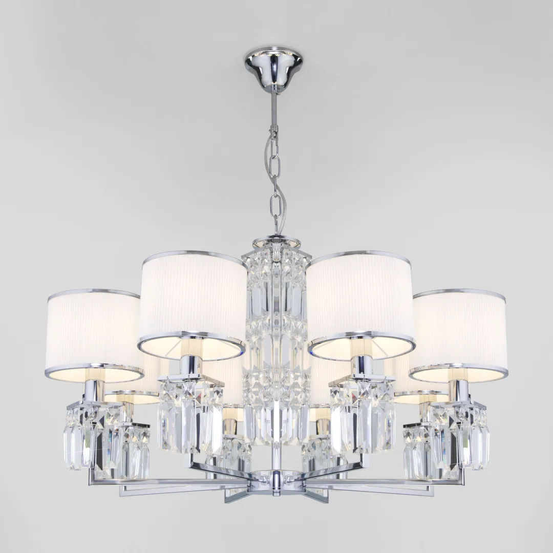 Подвесная люстра с абажурами 10099/8 хром/прозрачный хрусталь Strotskis предназначена для создания основного освещения в современных и классических интерьерах, подходит для различных типов помещений: гостиная, спальня и рассчитана на площадь освещения 14 м².