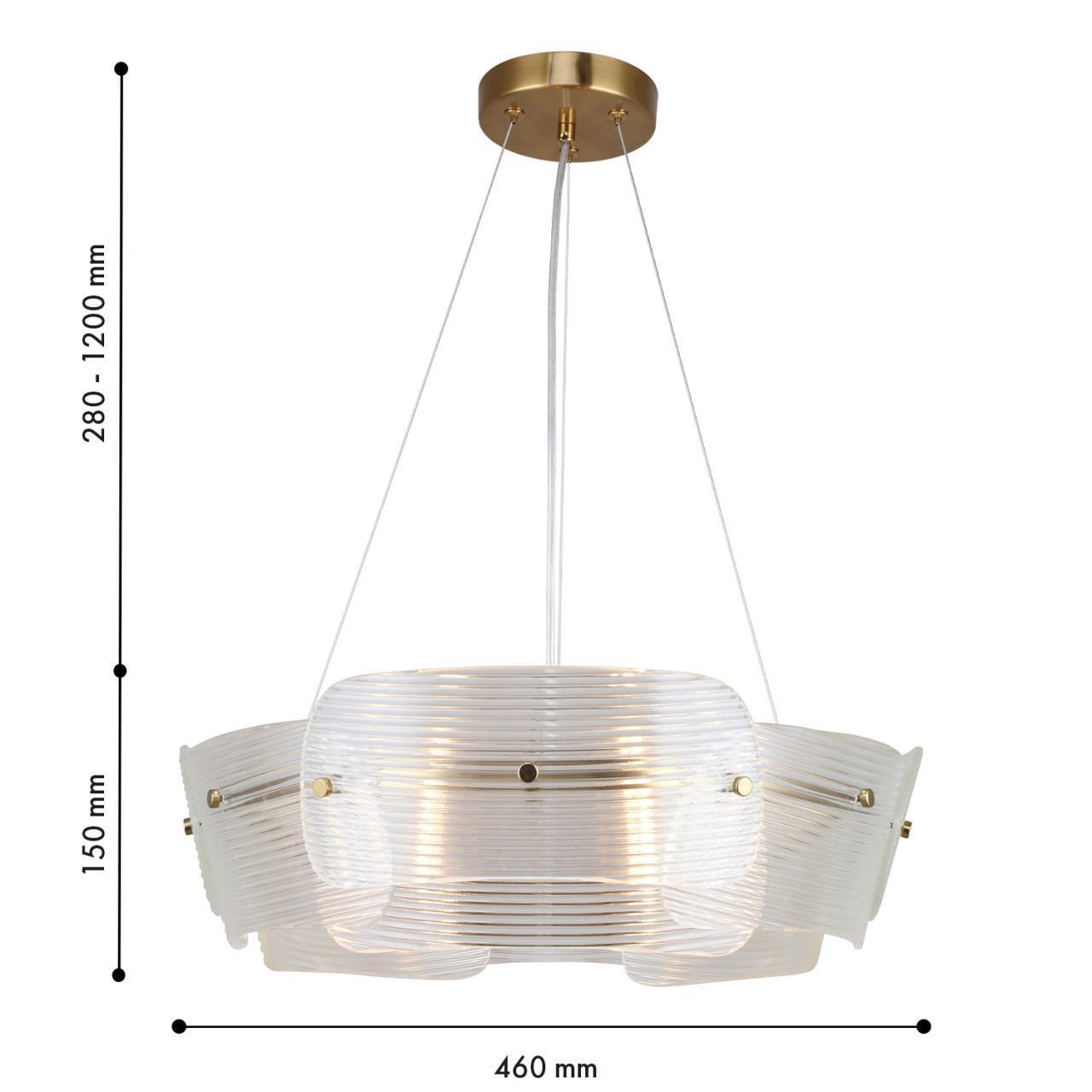 Металлический каркас в латунном цвете, плафон из прозачных стеклянных пластин, с матовыми, горизонтальными полосами, сменная лампа, регулируемая высота.