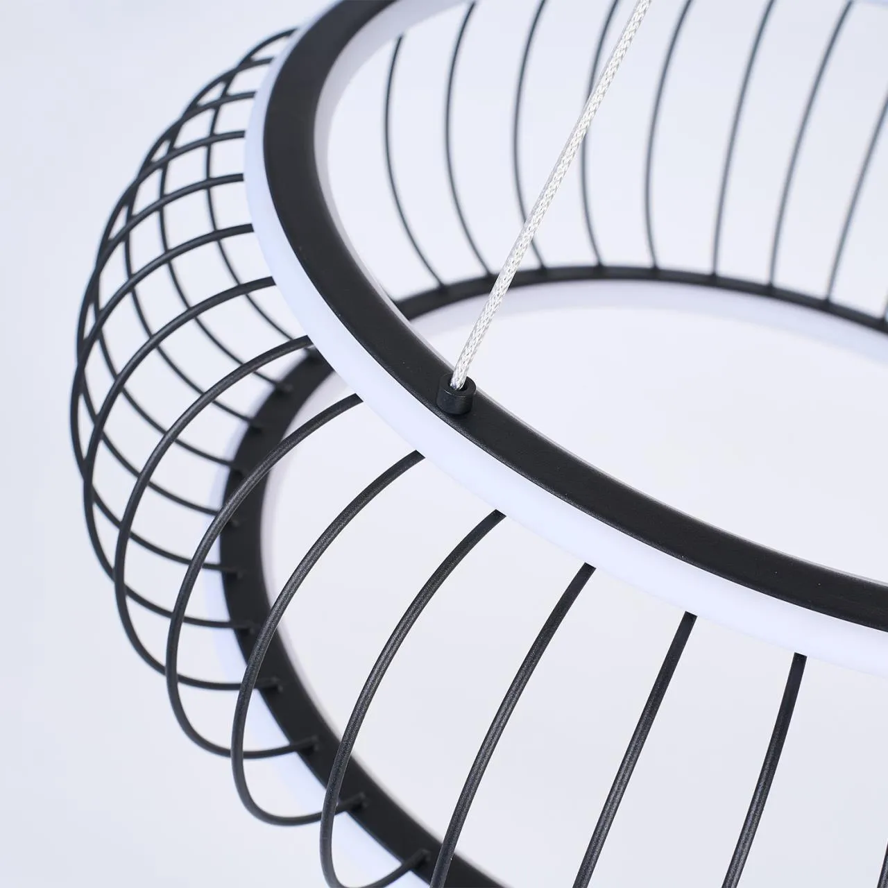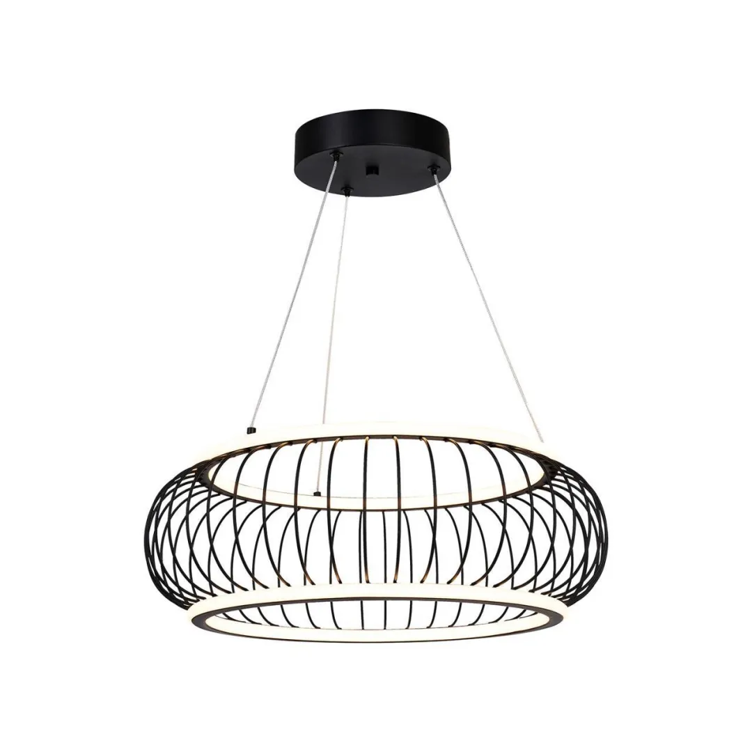 Плафон из черных матовых металлических прутиков, образующих решетку, два световых элемента LED в форме колец с рассеивателем из белого пластика, регулируемые мощность и температуру света, пульт управления в комплекте, регулируемая высота.