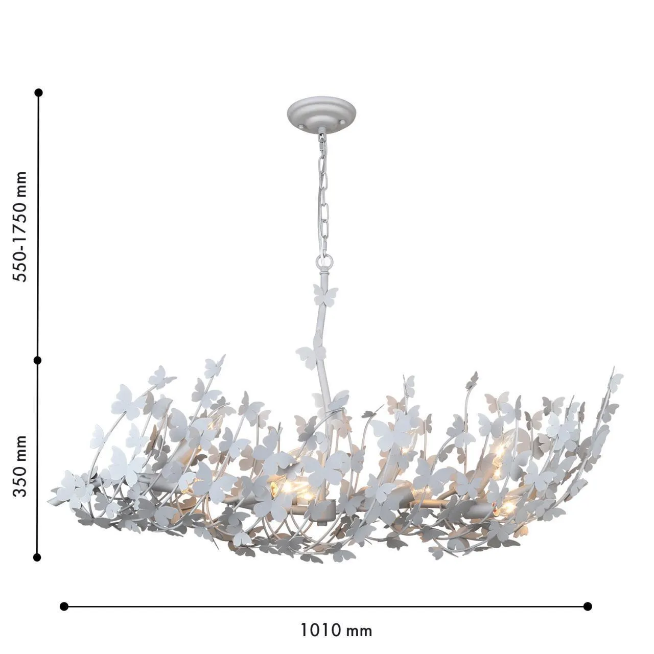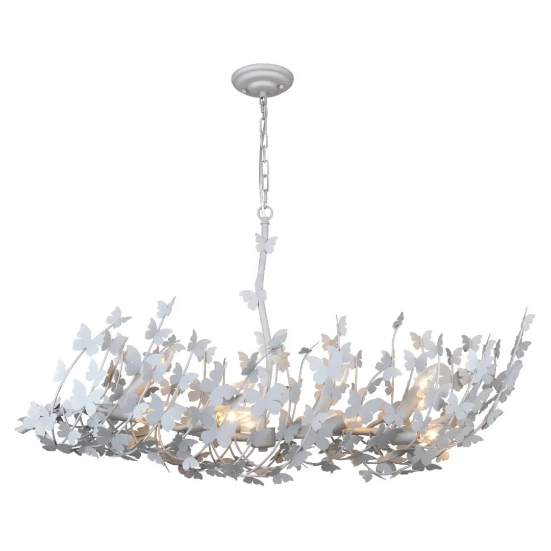 Металлический каркас, окрашенный в серебрянный цвет с патиной, декор в виде парящих бабочек, сменная лампа, регулируемая высота.