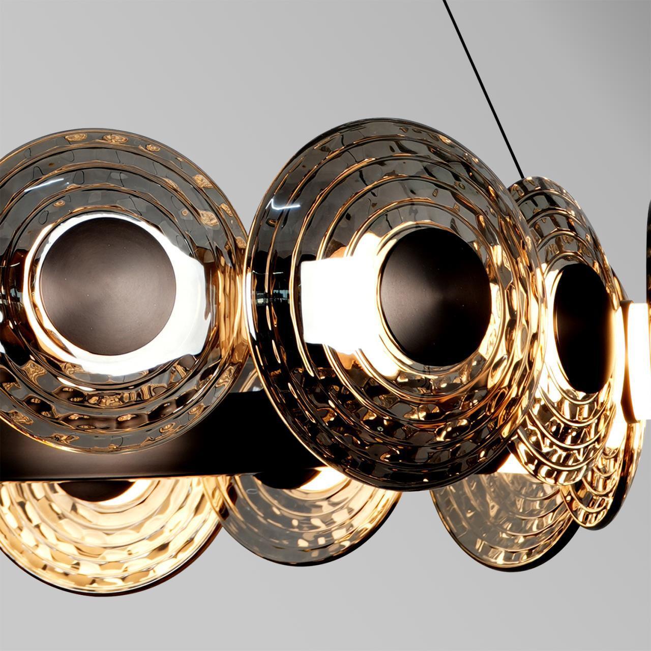 Металлический каркас черного матового цвета, закругленные фактурные плафоны разного диаметра из стекла дымчатосерого цвета, регулируемая высота, возможность использования универсальных креплений, LEDмодуль.