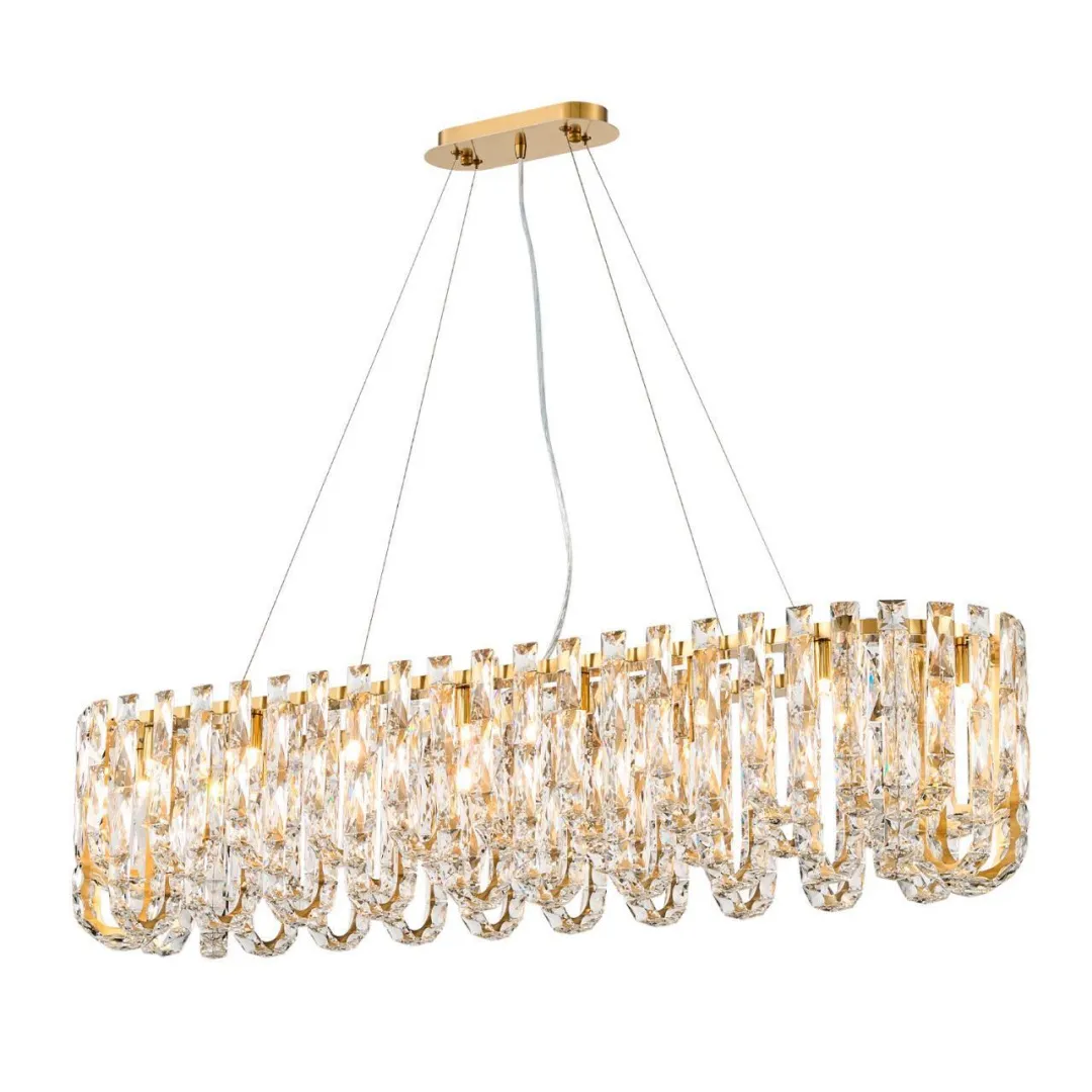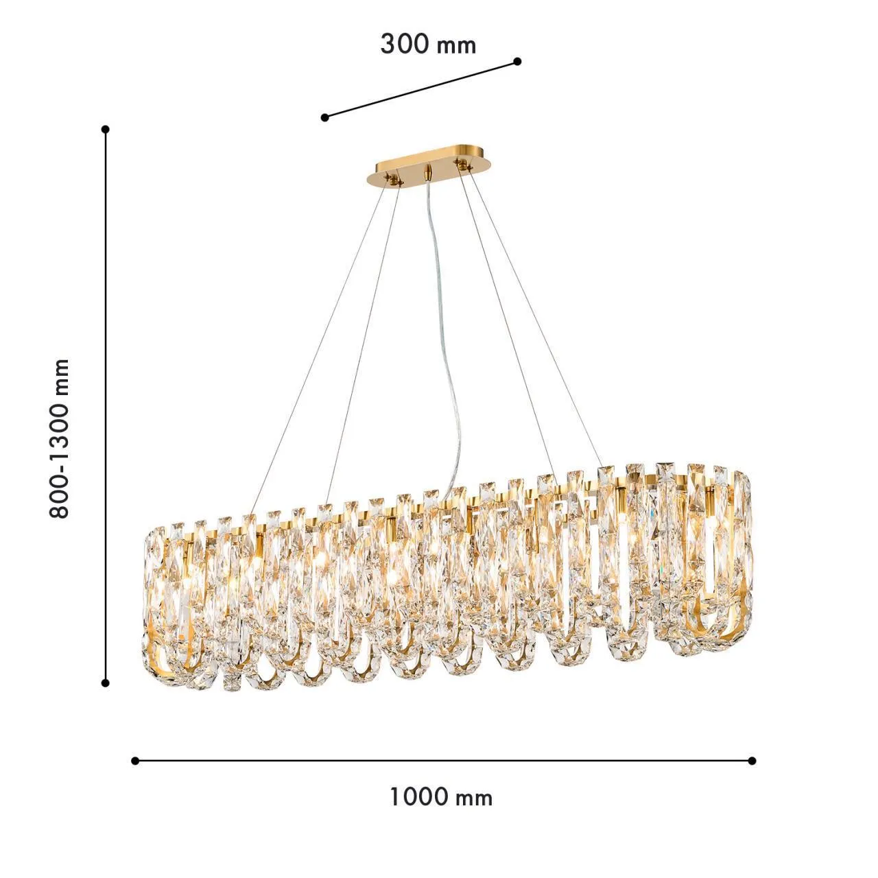 Каркас овальной формы из металла золотого цвета, декор из скрепленных между собой, прямоугольных, трапециевидных в разрезе, пластин из прозрачного хрусталя высшего качества, образующих полукруглые арочки, светодиодные лампы G9 с возможностью замены, регулируемая высота.