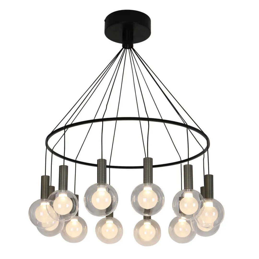 Метллический каркас матового черного цвета с плафонами из двойного стекла — прозрачного снаружи и матового внутри, декоративные цоколи в форме металлических цилиндров с рифленым решетчатым узором, LEDмодули.