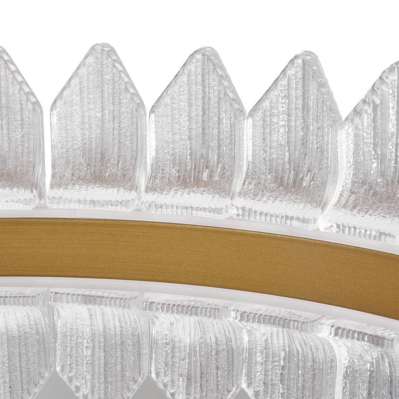 Кольцевая люстра с металлическим каркасом, окрашенным в латунный цвет, две LED ленты светят вверх и вниз через декоративные элементы в виде лепестков, выполненных из стекла по муранской технологии, регулируемая высота.