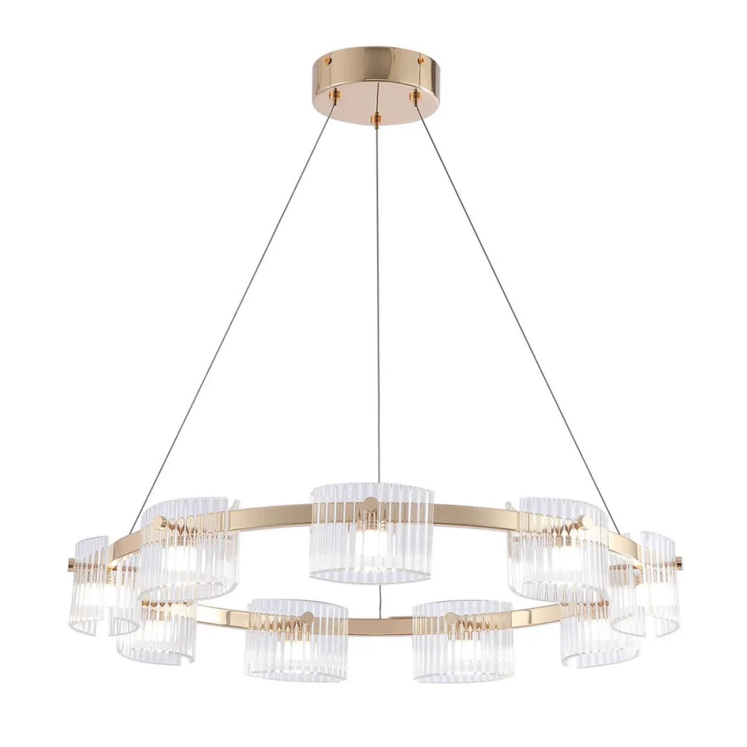 Металлический каркас в золотом цвете, с прозрачными рифлеными плафонами, каждый из которых состоит из двух слегка выгнутых стекол, закрепленных на заклепках с обеих сторон, модуль LED, регулируемая высота.