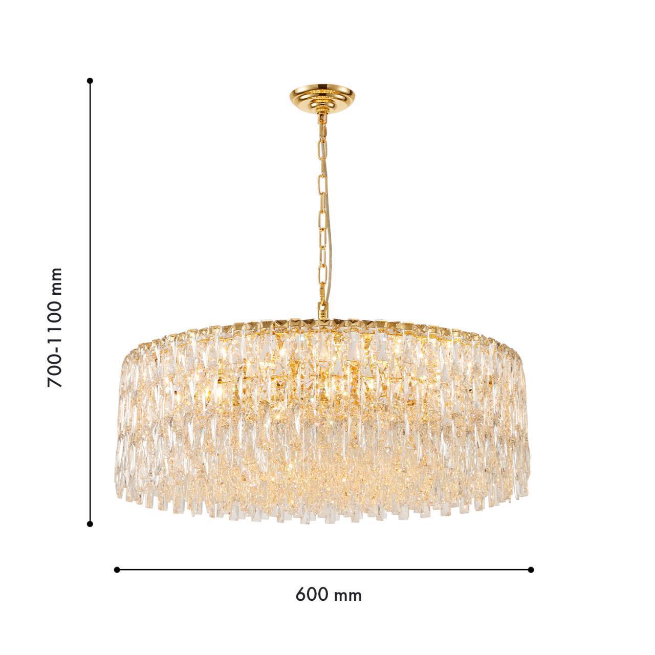 Каркас круглой формы из металла золотого цвета, декор из свободно висящих цепочек, состоящих из скрепленных между собой, прямоугольных, трапециевидных в разрезе, пластин из прозрачного хрусталя высшего качества, лампы накаливания с возможностью замены, регулируемая высота.