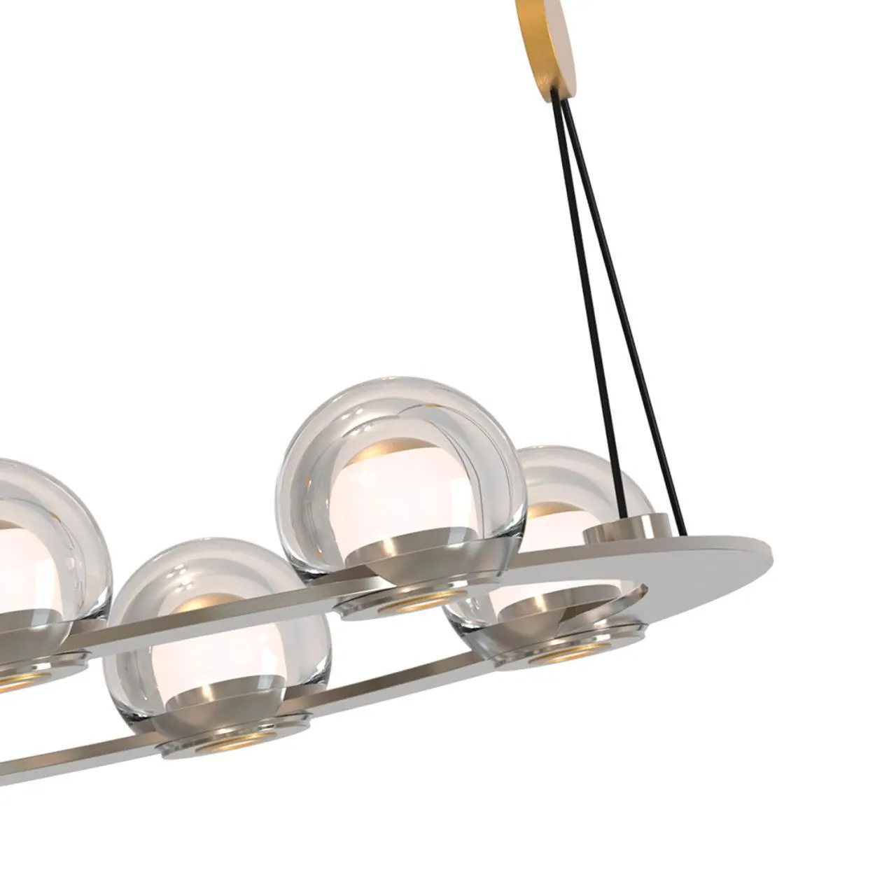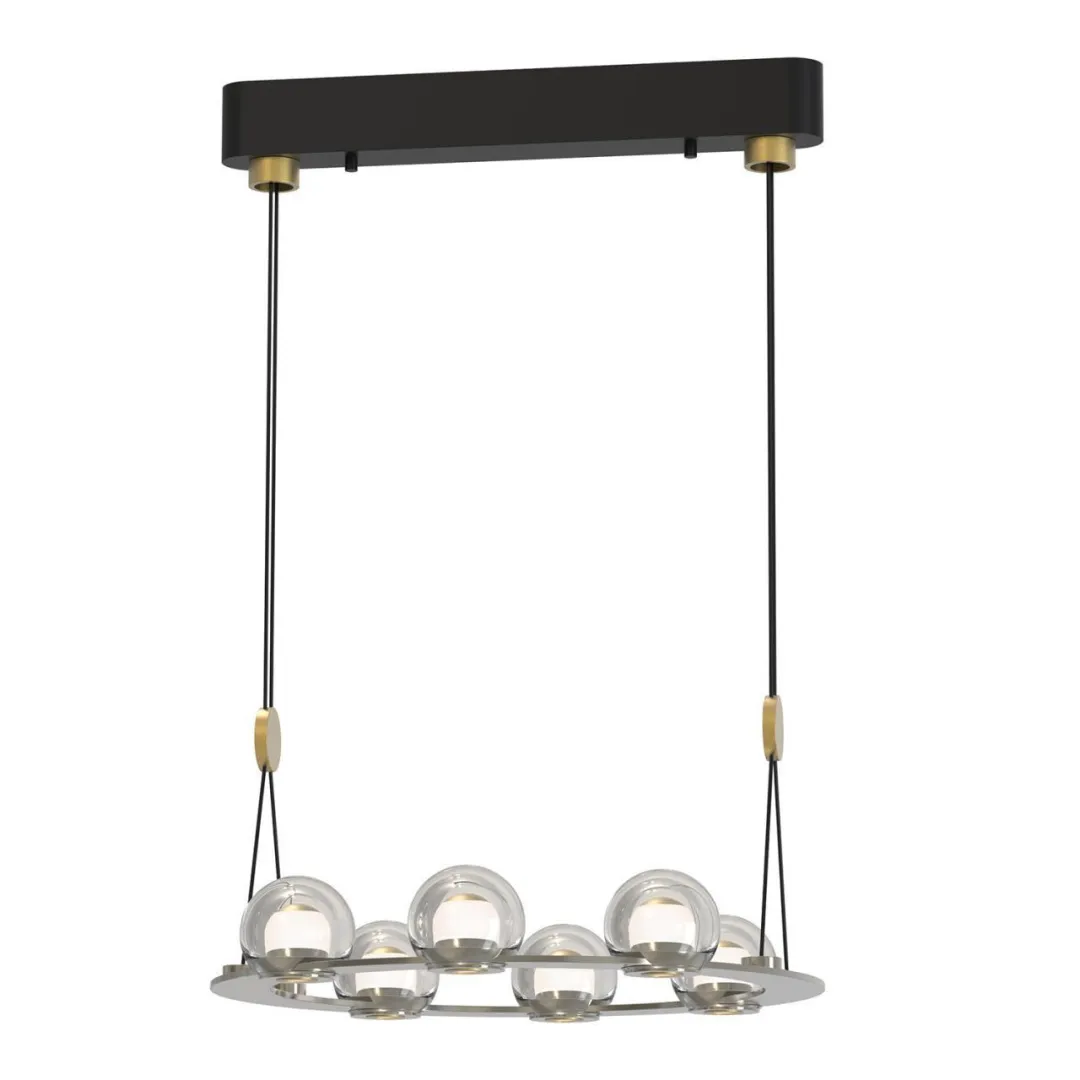 Подвесная люстра с черным каркасом, диаметром 52 см см со сферическими плафонами, двойной источник света внутри стеклянного плафона свет направлен вверх, спот в нижней части плафона светит вниз, регулируемая высота.