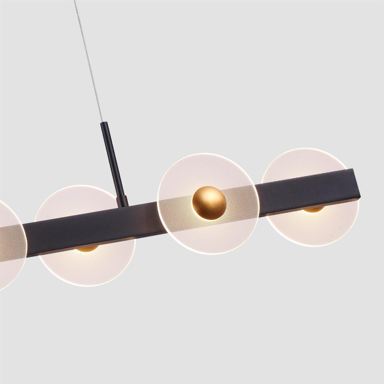 Каркас черного матового цвета, цилиндрические плафоны из акрила с узорным паттерном в виде белых точек, латунный элемент в центре. По внутреннему периметру диска на стыке с плафоном расположен LEDмодуль. Регулируемая высота.