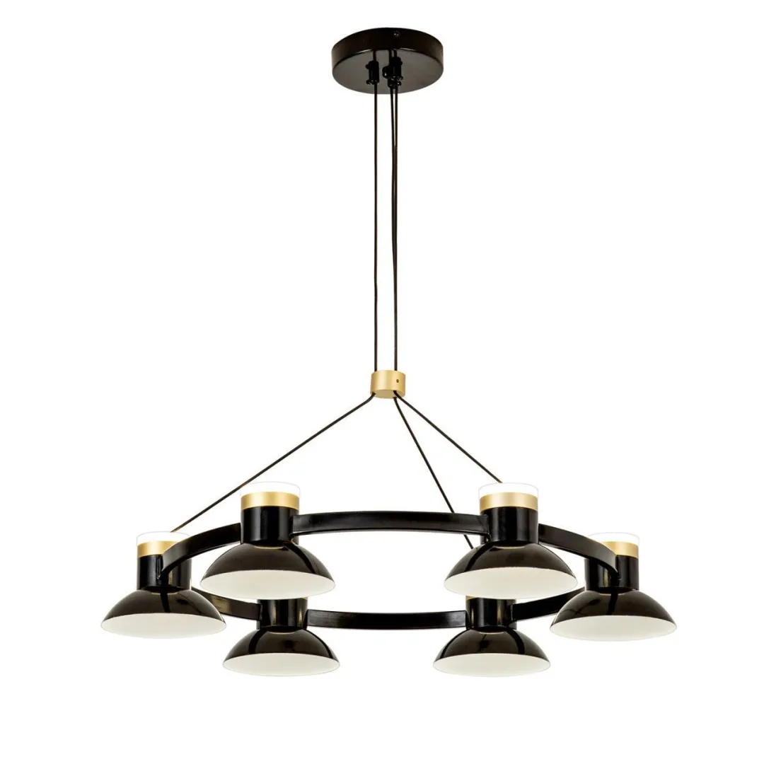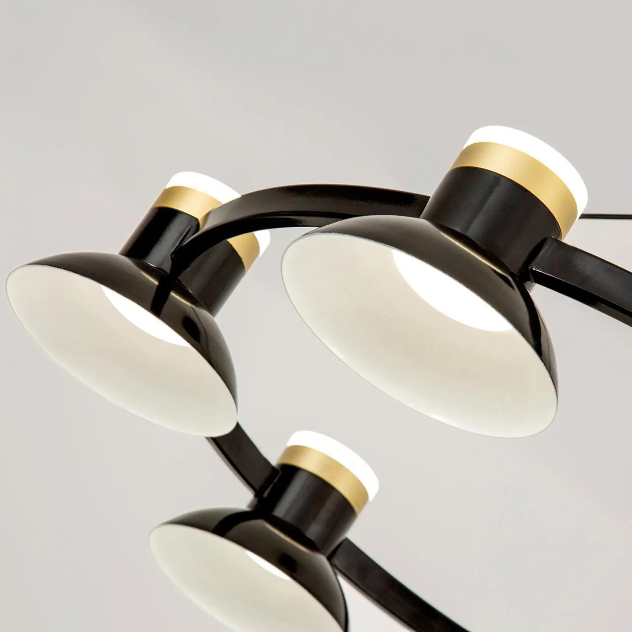 Черный глянцевый металлический каркас, акриловый плафон внутри абажура, дополнительный декоративный источник света в верхней части абажура, декоративный элемент из металла в цвете матовое золото.