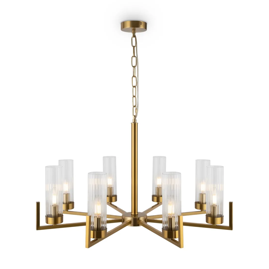 Дизайн на стыке классики и современности, выдержанная эстетика американского стиля в лаконичном исполнении. Adeline  – выбор тех, кто ценит традиции. Арматура из металла представлена в оттенках хрома и латуни. Её строгий силуэт подчеркнут минималистичными плафонами-цилиндрами. Граненое стекло с ребристым рисунком – актуальный тренд, создающий модный контраст фактур. Направленные вверх источники света равномерно распределяют световой поток по комнате и визуально приподнимают потолки. В серию входят люстры на 5, 8 ламп и бра – вы можете сформировать комплексный световой сценарий с общим и зональным освещением. Элегантный дизайн актуален для интерьеров в стиле неоклассика, ар-деко, модерн.