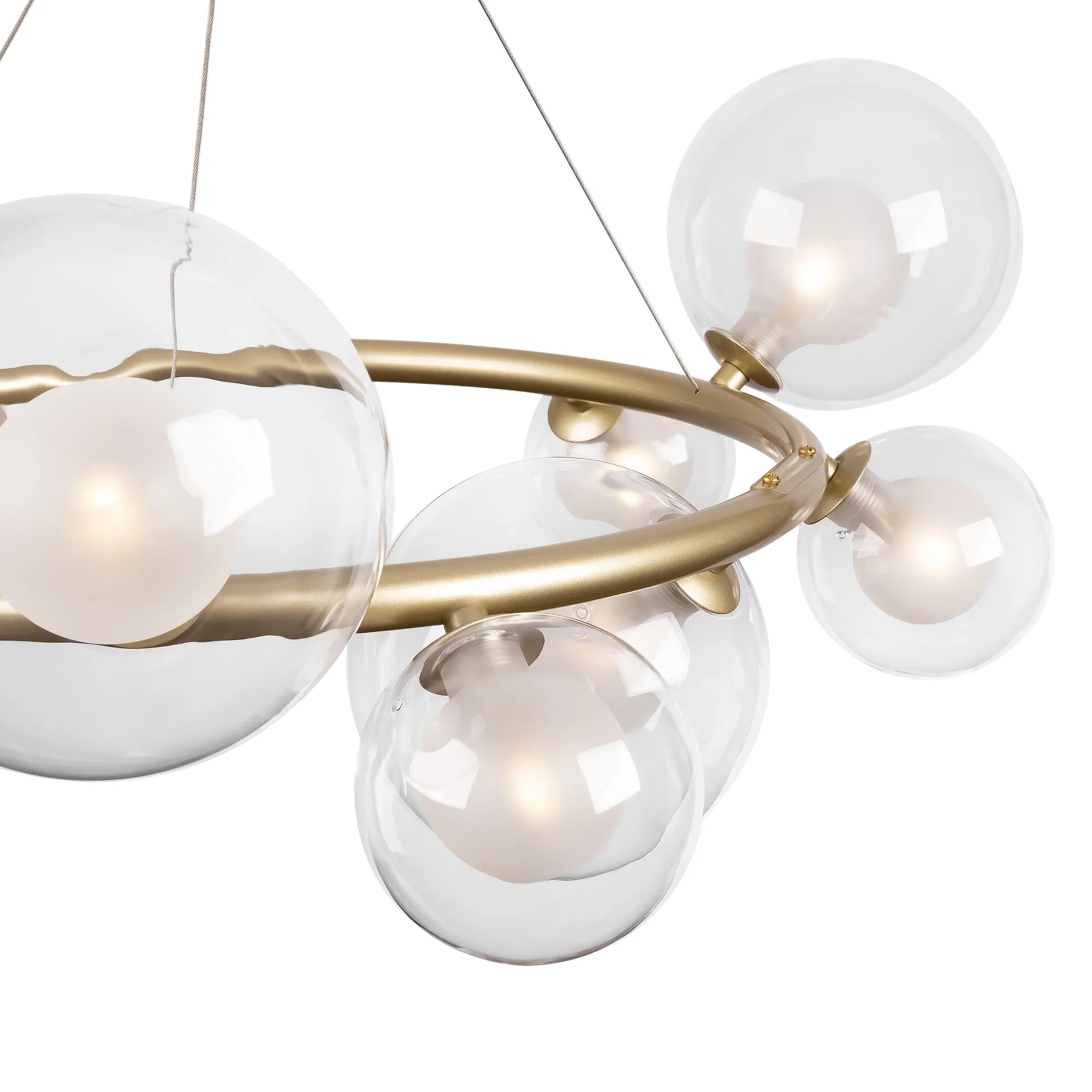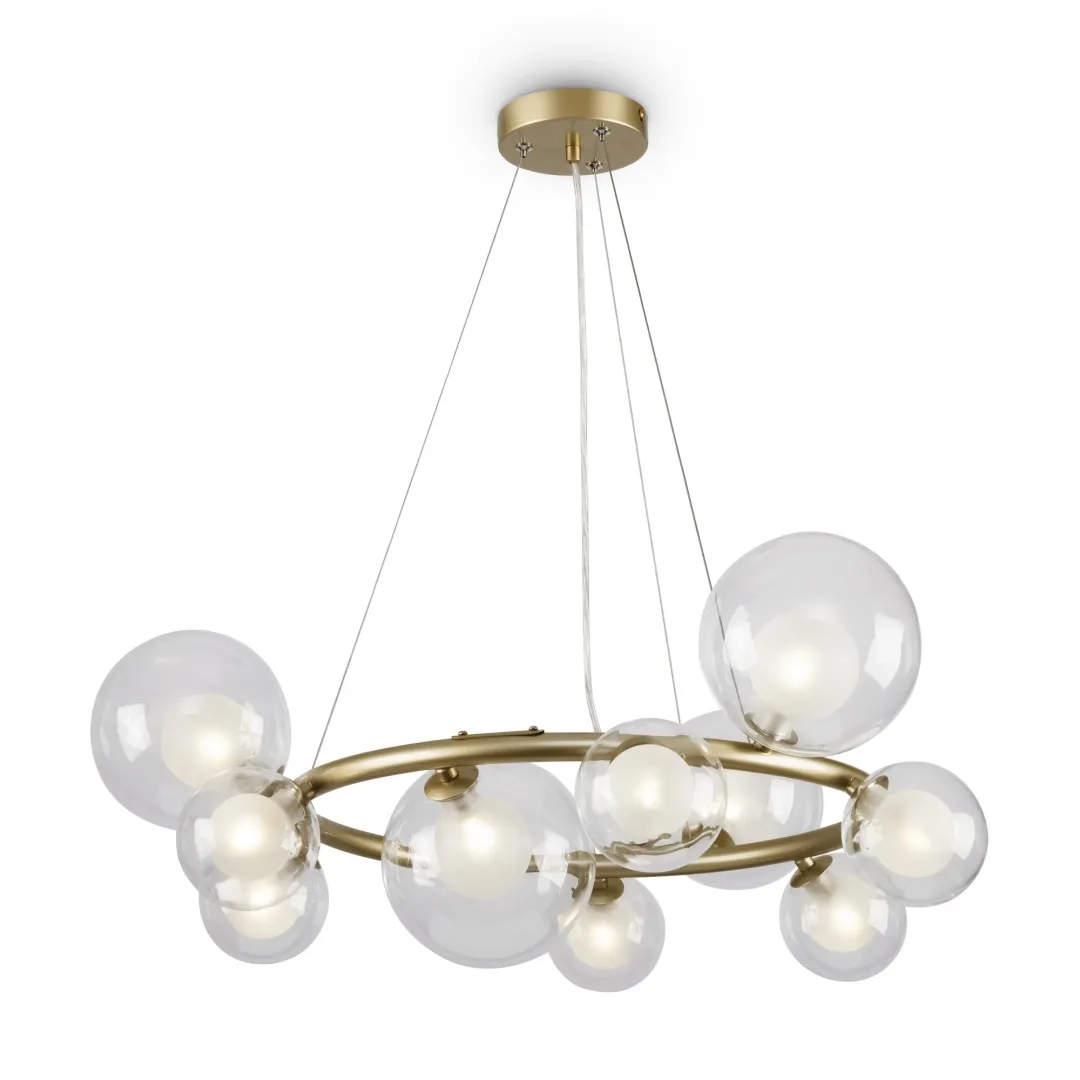 Создавая серию Duo, дизайнеры вдохновлялись стилистикой mid-century modern, в частности – «молекулярной» формой предметов. Латунного цвета арматура выполнена из металла, а двойные плафоны-сферы – из стекла. Внутренняя часть плафона – белого цвета, внешняя – прозрачная. Расположенные вдоль широкой окружности, они обеспечивают равномерное, яркое освещение. Визуальную легкость композиции подчеркивают тонкие, почти невидимые тросы – создается иллюзия трендового «парящего» света. Две подвесные люстры обеспечивают различную интенсивность подсветки – можно выбрать подходящий вариант (из 10 или 14 плафонов) с учетом размеров помещения. Светильники станут эффектным акцентным элементом обстановки в стиле mid-century modern, постмодерн, ар-деко, эклектика, хай-тек.