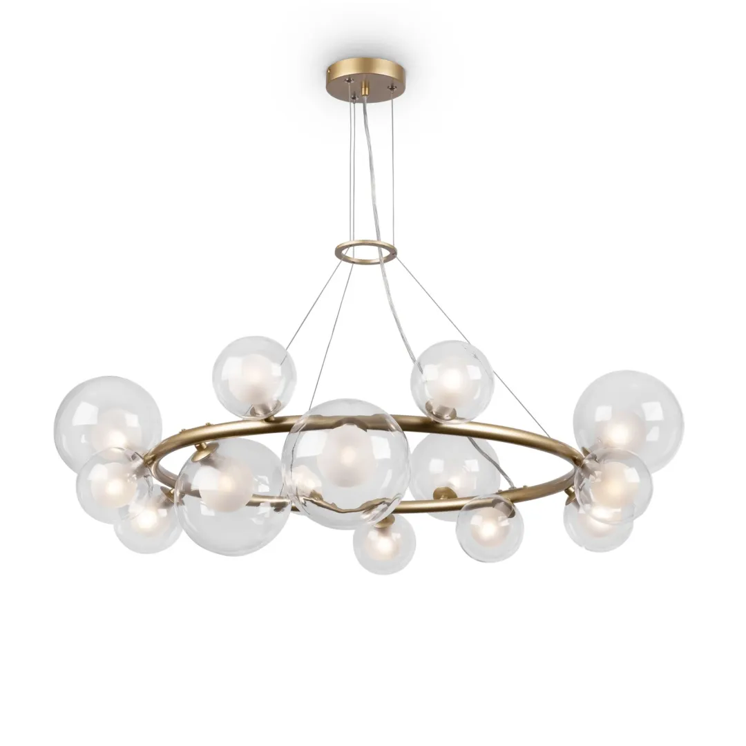 Создавая серию Duo, дизайнеры вдохновлялись стилистикой mid-century modern, в частности – «молекулярной» формой предметов. Латунного цвета арматура выполнена из металла, а двойные плафоны-сферы – из стекла. Внутренняя часть плафона – белого цвета, внешняя – прозрачная. Расположенные вдоль широкой окружности, они обеспечивают равномерное, яркое освещение. Визуальную легкость композиции подчеркивают тонкие, почти невидимые тросы – создается иллюзия трендового «парящего» света. Две подвесные люстры обеспечивают различную интенсивность подсветки – можно выбрать подходящий вариант (из 10 или 14 плафонов) с учетом размеров помещения. Светильники станут эффектным акцентным элементом обстановки в стиле mid-century modern, постмодерн, ар-деко, эклектика, хай-тек.