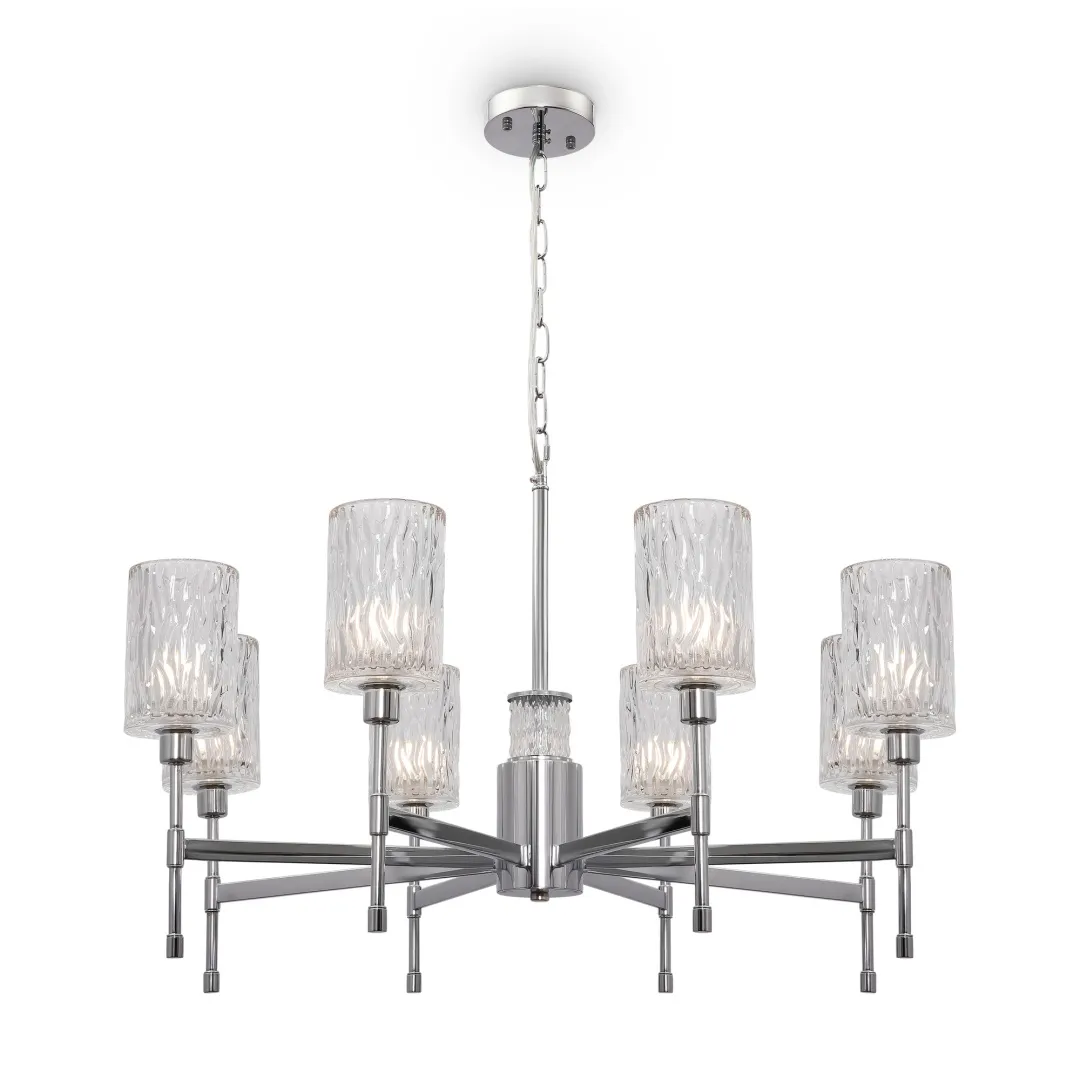 Строгие прямые линии в сочетании с изяществом неоклассики дают яркий, несколько эклектичный дуэт – эта серия приживется в различных стилевых решениях интерьера, как подчеркнуто классических, так и в современных. Хромированная металлическая арматура в сочетании с прозрачным стеклом дарит ощущение легкости и свежести. Интересно фактурное, рельефное исполнение плафонов – эта деталь добавляет композиции объема, многомерности и создает контраст с глянцевыми стеклянными рожками. Две люстры на 8/6 плафонов и бра позволяют организовать комплексное освещение пространства в единой стилистике.