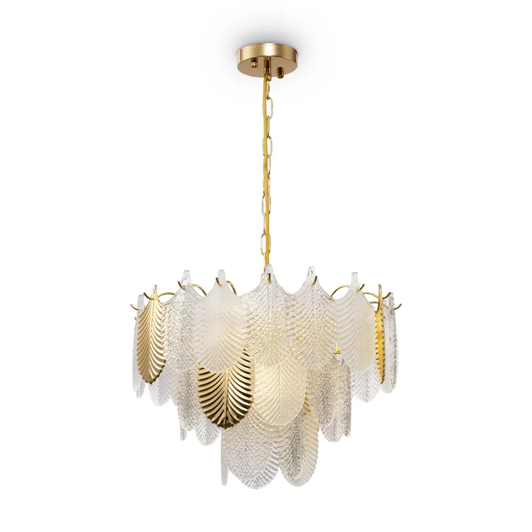 Серия Hloya сочетает традиционные элементы дизайна и новаторский подход в декоре – получается яркий, эклектичный образ, достойный как классических, так и современных интерьеров. Металлическая арматура светильника окрашена в цвет французского золота, а фактурные стеклянные пластины обрамляют источники света. Часть из них также выполнена в оттенке французского золота, подчеркивающем статус и роскошь модели. Рельефные лепестки напоминают о модном флористическом дизайне, актуализированном в последние годы. Две подвесные люстры различного диаметра станут эффектным акцентом в интерьере, оформленном в стиле ар-деко, модерн, фьюжн, эклектика. Будучи основным источником света в гостиной или спальне, модель подарит обстановке радужные переливы и комфортное, расслабляющее освещение.