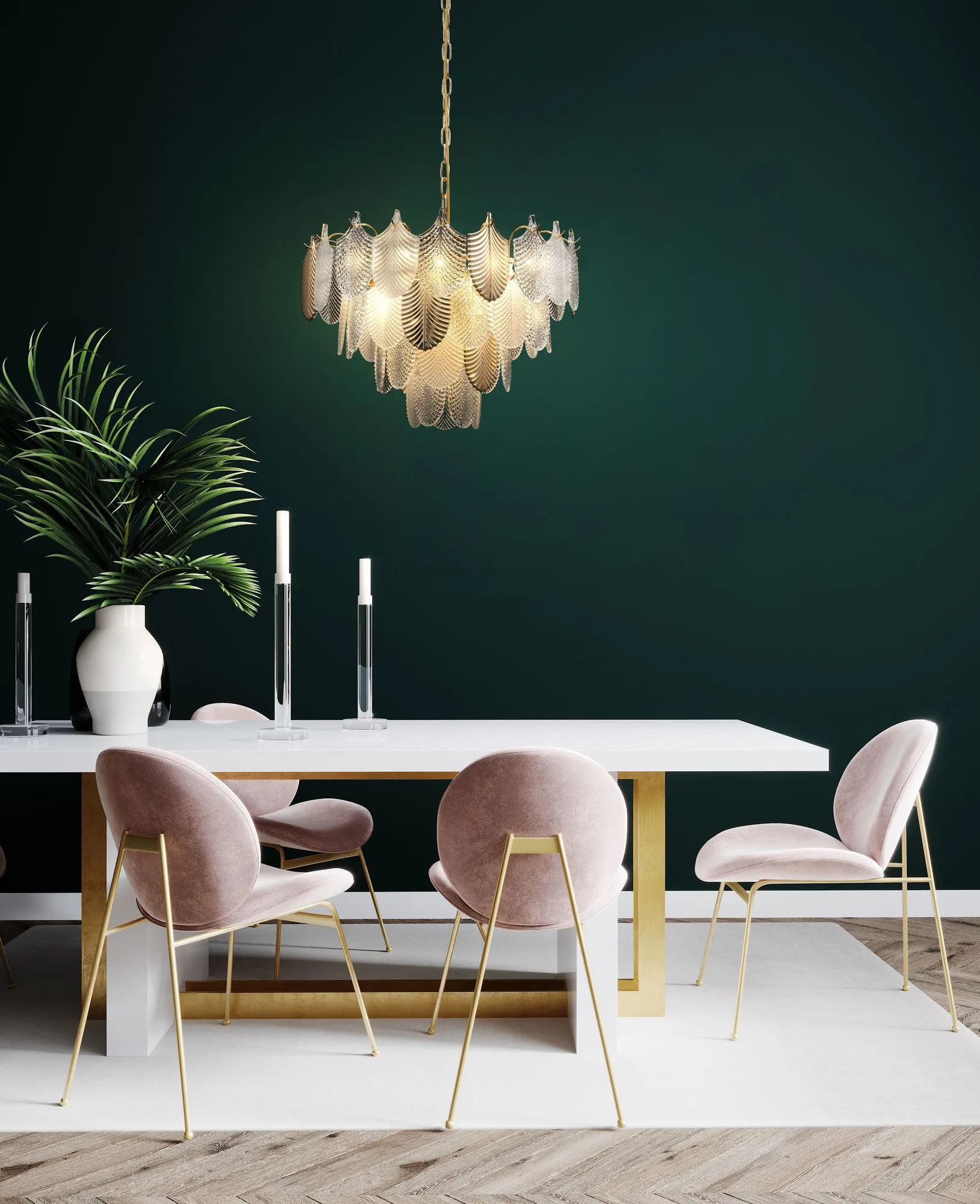 Серия Hloya сочетает традиционные элементы дизайна и новаторский подход в декоре – получается яркий, эклектичный образ, достойный как классических, так и современных интерьеров. Металлическая арматура светильника окрашена в цвет французского золота, а фактурные стеклянные пластины обрамляют источники света. Часть из них также выполнена в оттенке французского золота, подчеркивающем статус и роскошь модели. Рельефные лепестки напоминают о модном флористическом дизайне, актуализированном в последние годы. Две подвесные люстры различного диаметра станут эффектным акцентом в интерьере, оформленном в стиле ар-деко, модерн, фьюжн, эклектика. Будучи основным источником света в гостиной или спальне, модель подарит обстановке радужные переливы и комфортное, расслабляющее освещение.