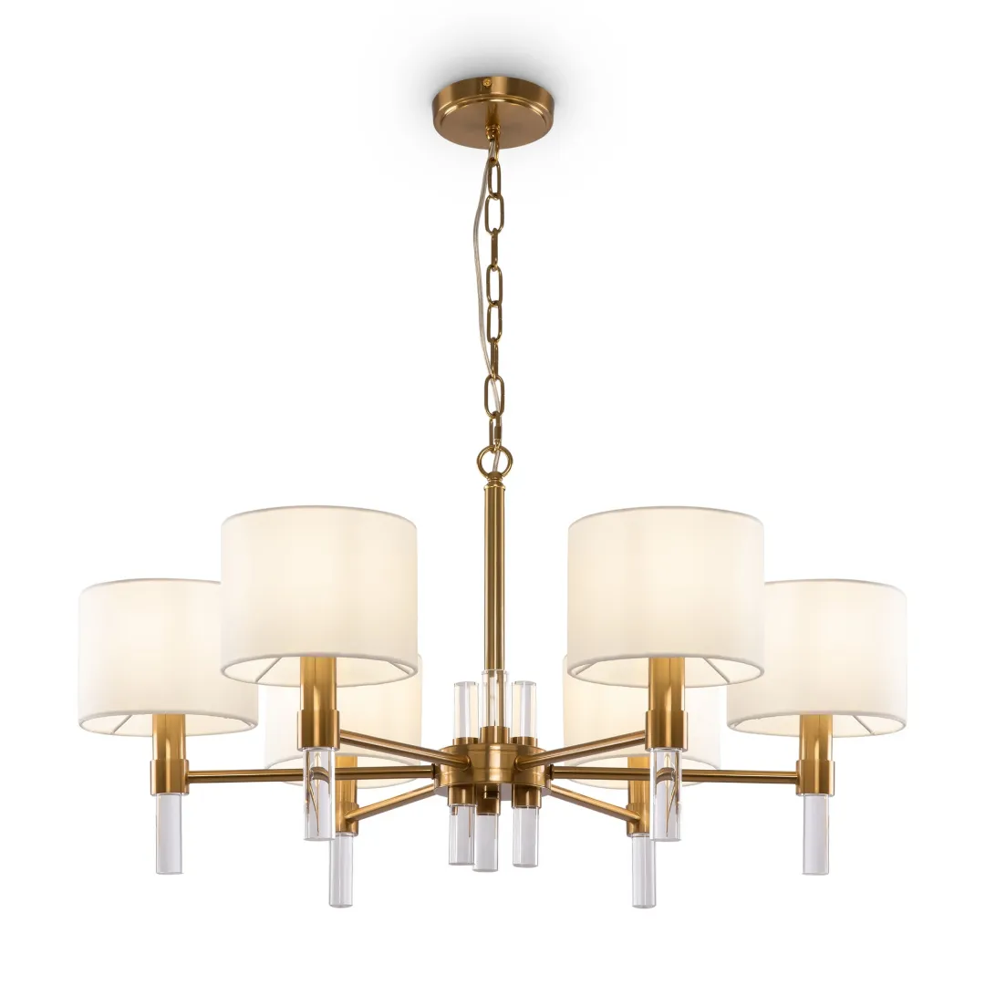 Серия Lino – это элегантная интерпретация современной классики. Металлическая арматура светильников окрашена в благородный оттенок латуни. Белоснежные тканевые абажуры мягко приглушают световой поток. Симметричность элементов создает легкий образ, а декор – прозрачные акриловые трубки – подчеркивает невесомость композиции.  Комбинация фактур и материалов – модный тренд, добавляющий освещаемому пространству объема и глубины. Серия предназначена для комплексной подсветки интерьера, включает как общие, так и зональные источники света: подвесную люстру на 6 и 8 плафонов, одиночный подвес, настольную лампу, торшер и бра. Широкий выбор позволяет сформировать разнообразные световые сценарии в обстановках, оформленных в стиле неоклассика, модерн, ар-деко, эклектика.