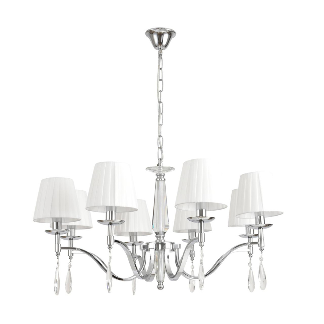 Торжественная модель MAGDA достойна вашего восхищения. Центральный декоративный элемент, изготовленный из чистейшего хрусталя, привлекает соим великолепием. Крупные хрустальные подвески преломляют свет и горят мириадами разноцветных искр. Высокие подсвечники, увенчанные традиционными классическими белыми абажурами, добавляют модели торжественности и статусности.