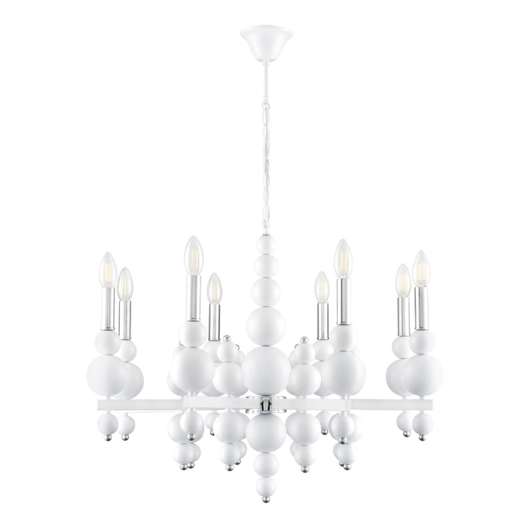 Светильники линии NANA имеют уникальный запоминающийся дизайн. Арматура светильников состоит их декоративных белых сферических элементов разного диаметра. А хромированные элементы в модели добавляют ей изысканности и очарования. В коллекции NANA имеются люстры на 6 и 8 ламп, а аткже бра на 1 лампу.