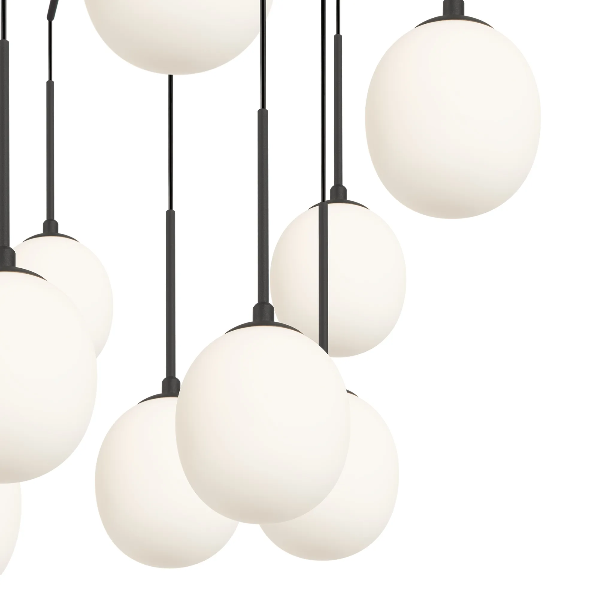 Металлическое основание, цвет - золото. Черная матовая арматура. Регулируемая высота плафонов за счет изменения длины проводов. Овальные плафоны из белого матового стекла с резьбой для удобной самостоятельной замены ламп. Цоколь G9. Лампы в комплект не входят.