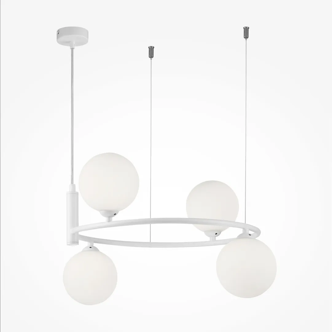 Простые и визуально легкие светильники серии Ring позволят без усилий организовать общую подсветку интерьера. На округлом металлическом каркасе располагаются плафоны из выдувного матового стекла. Модели серии представлены в различных формах и палитрах. Арматура нейтрального белого, черного цвета, а также оттенка латуни легко дополнит любое цветовое решение интерьера. Высоту подвесных светильников на 6, 4 и 2 плафона возможно отрегулировать длиной тросов и провода.