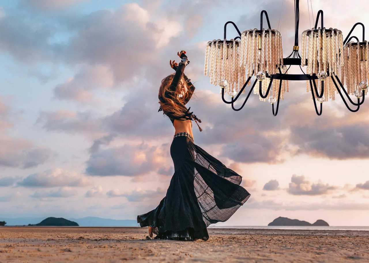 Металлическое основание окрашено в черный цвет. Отдельные элементы светильника гальванизированы в цвет бронзы. Светильник декорирован стеклянными извитыми элементами, гальванизированными в цвет топаз.