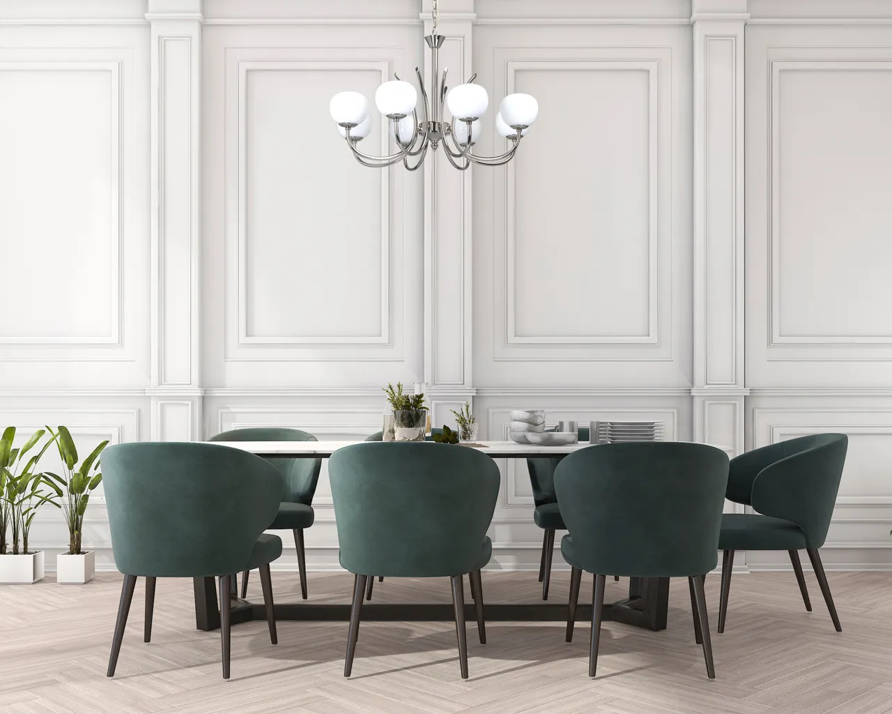 Металлическое основание светильника гальванизировано в цвет хрома. Стеклянные плафоны вытянутой формы окрашены в белый цвет изнутри.