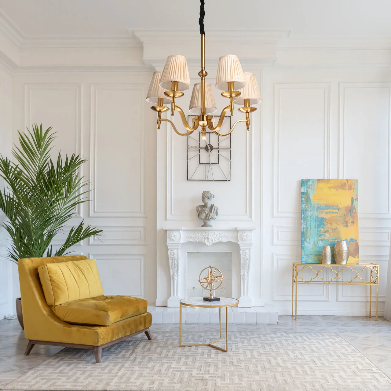 Металлическое основание светильника гальванизировано в цвет медовая бронза. Светильник декорирован текстильными абажурами бежевого цвета.