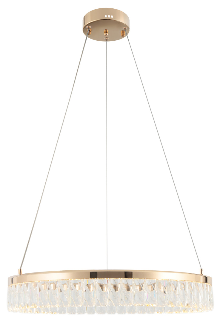 Главной дизайнерской особенностью люстры является большой золотой плафон в форме кольца диаметром 500 мм. Встроенные в плафон-кольцо светодиоды обеспечивают равномерное и мягкое освещение. Подвесная люстра дополнена изысканными хрустальными подвесками с уникальной гравировкой по стеклу, что придаёт ей особый шарм и делает её центральным акцентом в любом интерьере.