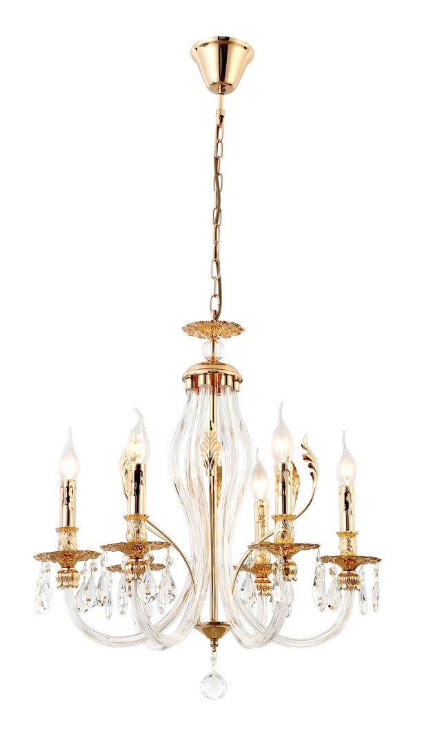 Серия, воплощающая в себе праздник, радость, солнце! Стойкое золотое покрытие канделябров и флористичный декор в любой сезон дарят приятные мысли о лете, тепле и природе. Особую нежность люстрам и бра Melanie придают прозрачные капли-кристаллы, напоминающие об утренней росе. Коллекция представлена 6-ти рожковой подвесной люстрой на цепи.