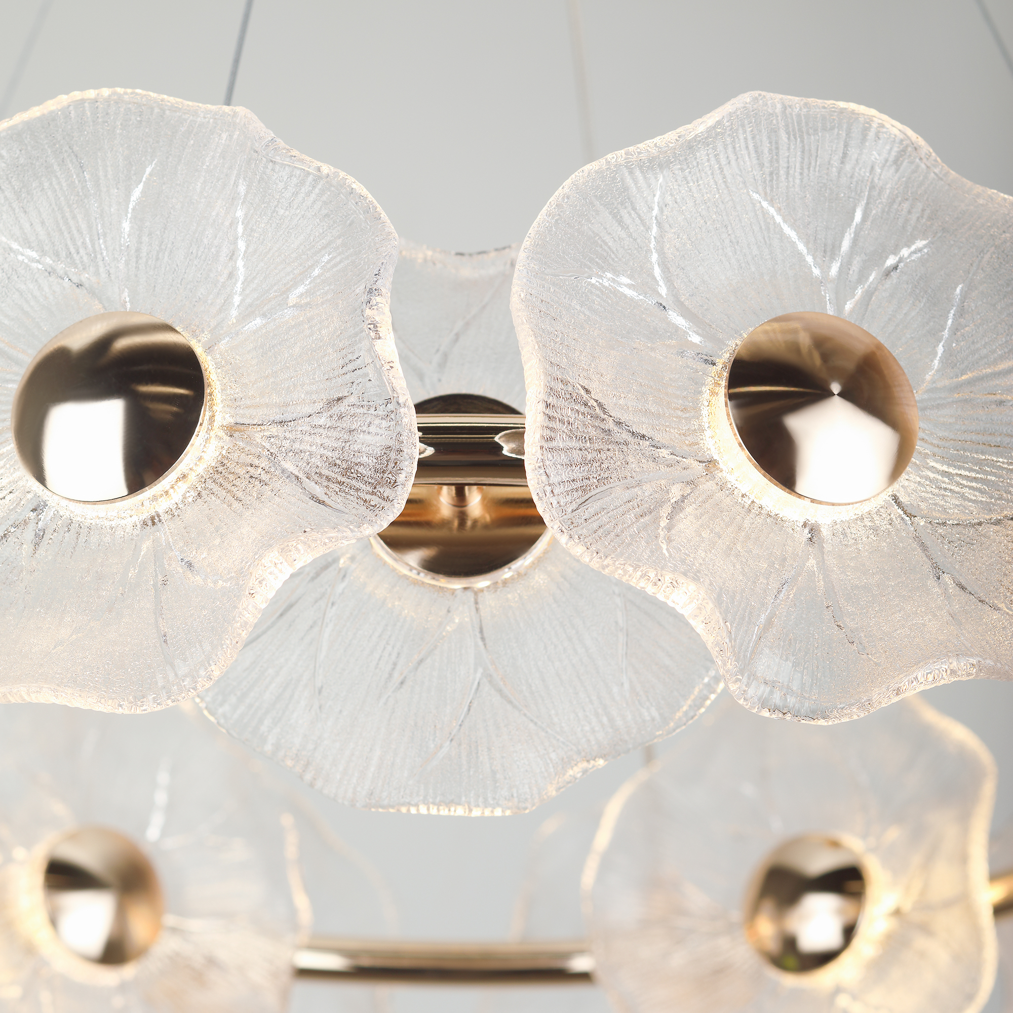 Отличительной особенностью этой нежной элегантной коллекции от европейских дизайнеров стали прозрачные стеклянные плафоны в виде распустившихся цветков. Цветы из высококачественного стекла выполнены филигранно и реалистично, повторяя форму, изгибы и узоры живых соцветий.