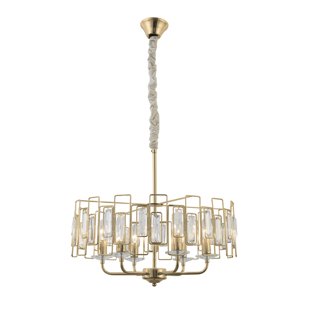 Rivoli Waltraud (арт. 1028-206) - уникальная хрустальная люстра в модном современном исполнении. Крупные декоративные элементы из чистейшего прозрачного хрусталя расположены в индивидуальных прямоугольных ячейках из металла золотого цвета. Абажур люстры (диаметр - 560 мм) формируют канделябры трендовой выверенной формы. Хрусталь подчеркивает красоту излучаемого люстрой света.