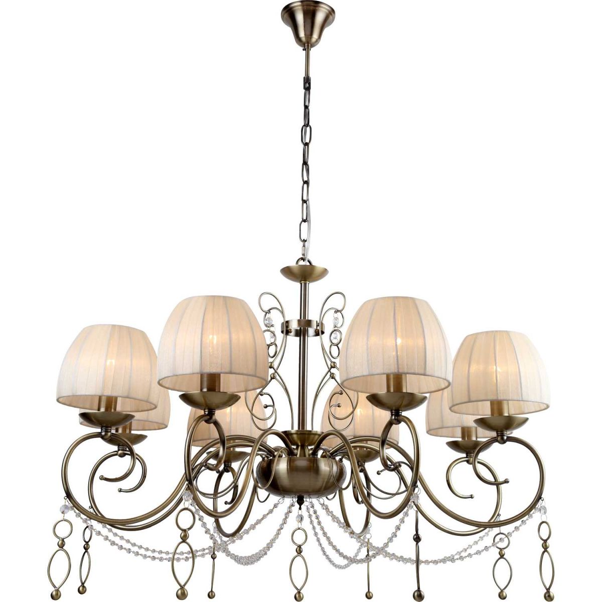 Люстра подвесная из коллекции Amore выполнена из металла, гальванизированного в цвет бронзы, и декорирована текстильными абажурами бежевого цвета и прозрачными хрустальными бусами.