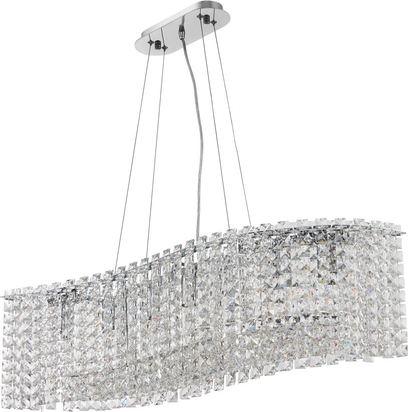 Люстра подвесная вытянутой формы из коллекции DELONE выполнена из металла, гальванизированного в цвет хрома, и декорирована подвесками из прозрачного хрусталя в форме октагон. Светильники коллекции отличает оригинальный дизайн и дополнительный декор из хрусталя, закрывающий источники света снизу.