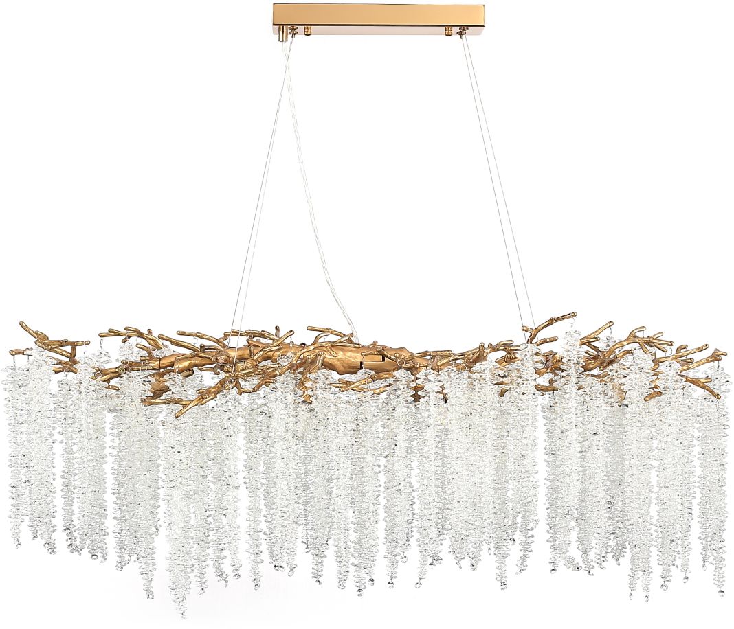 Люстра подвесная вытянутой формы коллекции EIVA выполнена из сплава алюминия, гальванизирована в цвет бронзы и декорирована гроздьями из хрусталя в форме октагон. Светильники отличает увеличенное количество хрусталя (120 хрустальных гроздьев), фактурная чеканка на потолочной чаше и лампы с цоколем Е14. Из данной коллекции светильников можно сделать индивидуальный заказ любого цвета и размера.