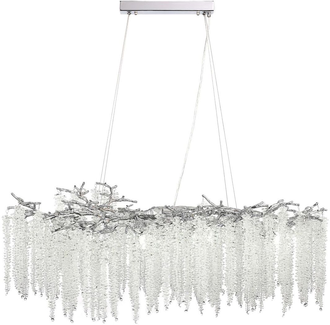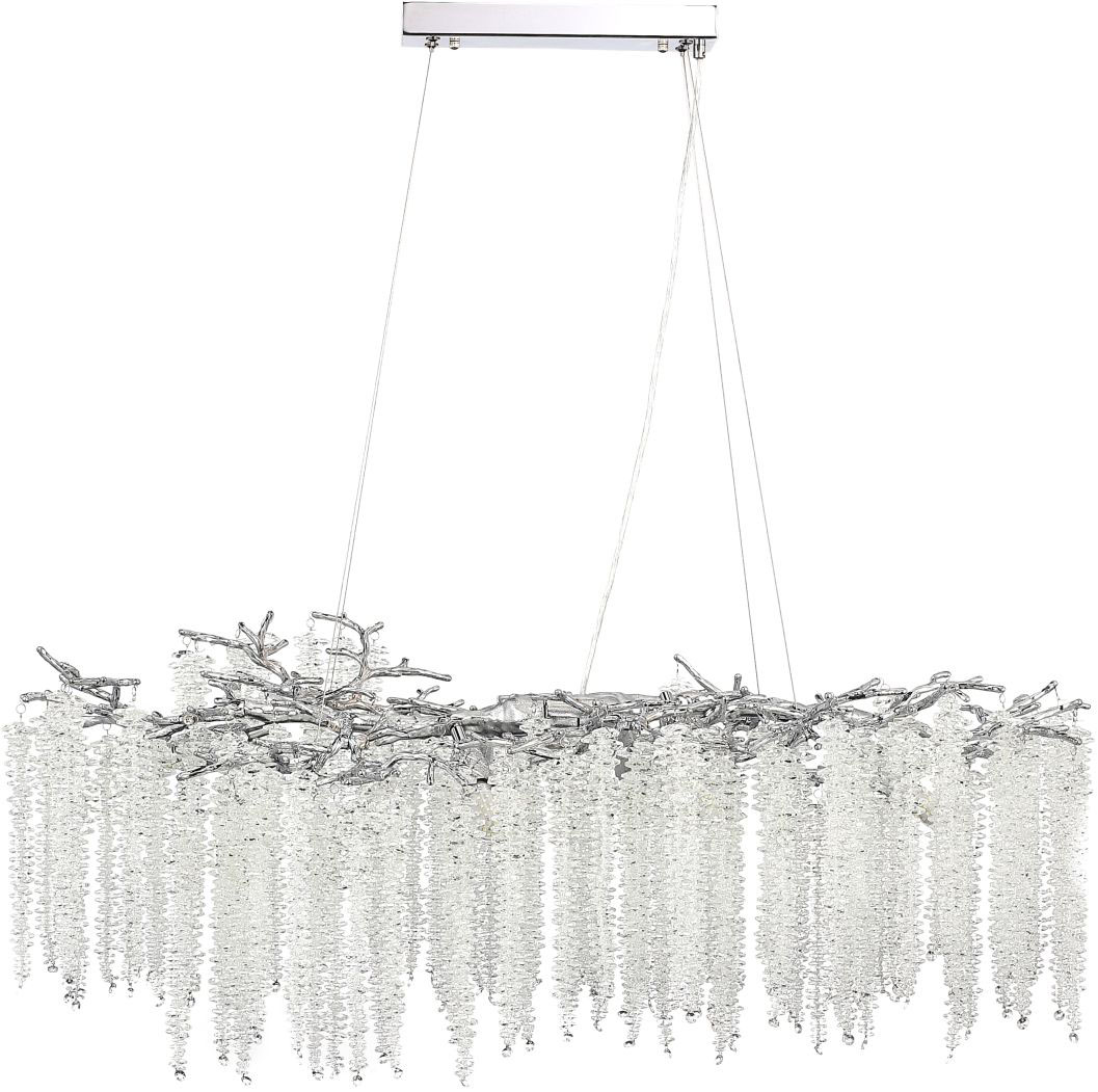 Люстра подвесная вытянутой формы коллекции EIVA выполнена из сплава алюминия, гальванизирована в цвет хрома и декорирована гроздьями из хрусталя в форме октагон. Светильники коллекции отличает увеличенное количество хрусталя (120 хрустальных гроздьев), фактурная чеканка на потолочной чаше и лампы с цоколем Е14. Из данной коллекции светильников можно сделать индивидуальный заказ любого цвета и размера.