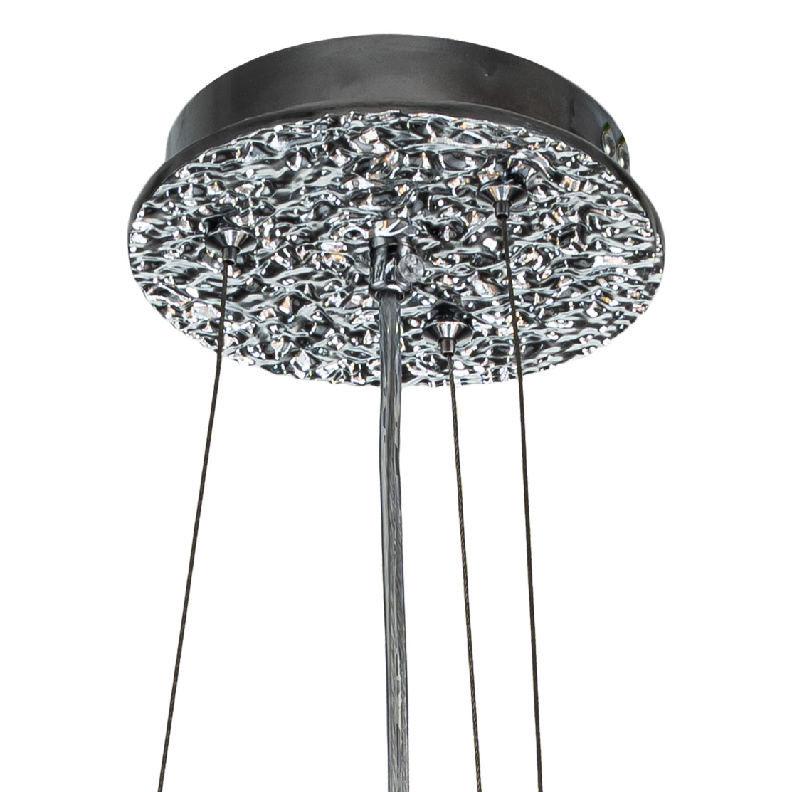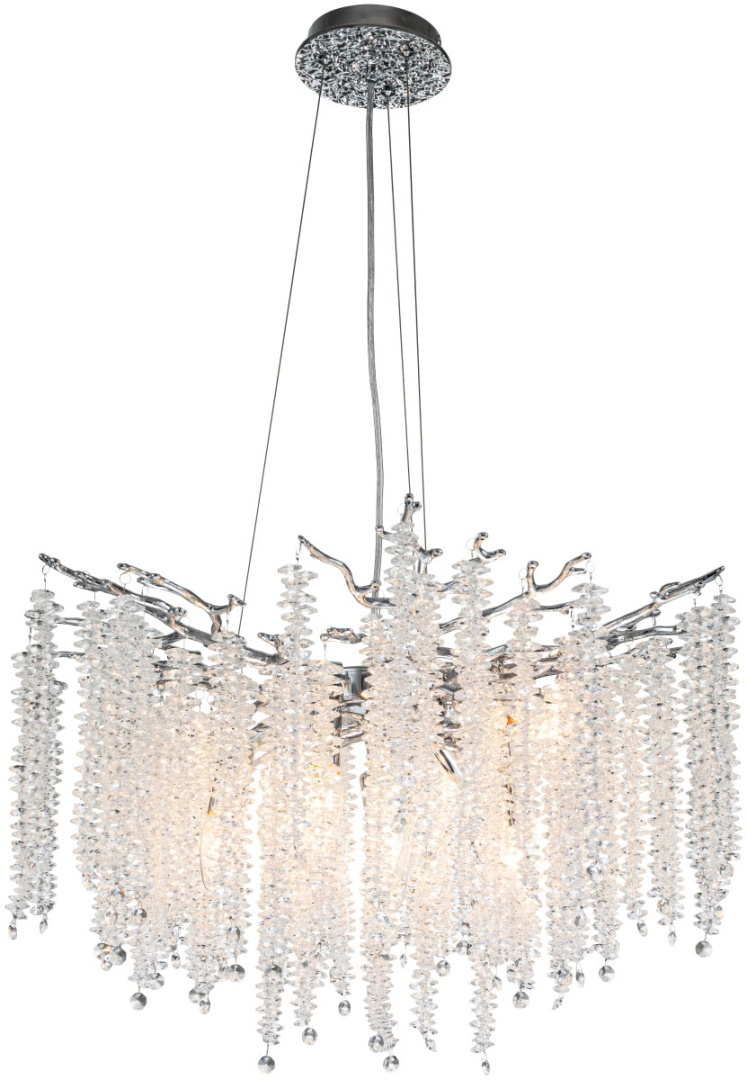 Люстра подвесная коллекции EIVA выполнена из сплава алюминия, гальванизирована в цвет хрома и декорирована гроздьями из хрусталя в форме октагон. Светильники коллекции отличает увеличенное количество хрусталя (76 хрустальных гроздьев), фактурная чеканка на потолочной чаше и лампы с цоколем Е14. Из данной коллекции светильников можно сделать индивидуальный заказ любого цвета и размера.