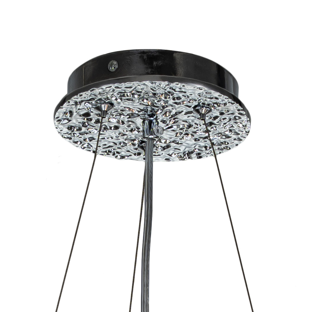 Люстра подвесная коллекции EIVA выполнена из сплава алюминия, гальванизирована в цвет хрома и декорирована гроздьями из хрусталя в форме октагон. Светильники коллекции отличает увеличенное количество хрусталя (101 гроздь), фактурная чеканка на потолочной чаше и лампы с цоколем Е14. Из данной коллекции светильников можно сделать индивидуальный заказ любого цвета и размера.