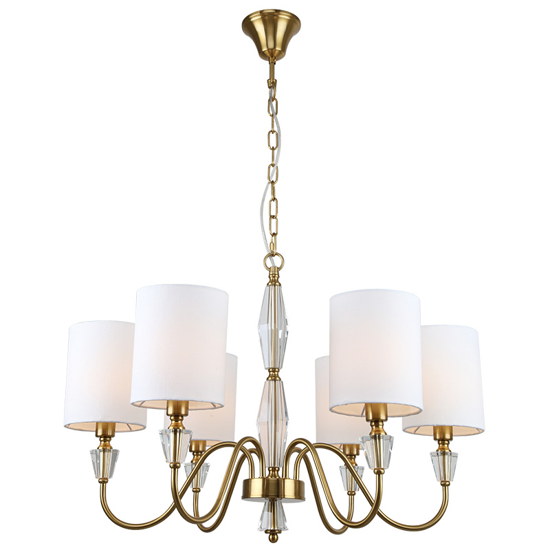 Люстра подвесная из коллекции Estetio выполнена из металла, гальванизированного в цвет бронзы, и декорирована прозрачным массивом хрусталя. Текстильные абажуры белого цвета с термостойким акрилом внутри создают мягкий рассеянный свет. Премиальное качество и неповторимыи? дизаи?н светильников идеально подои?дут как в классические, так и современные интерьеры.