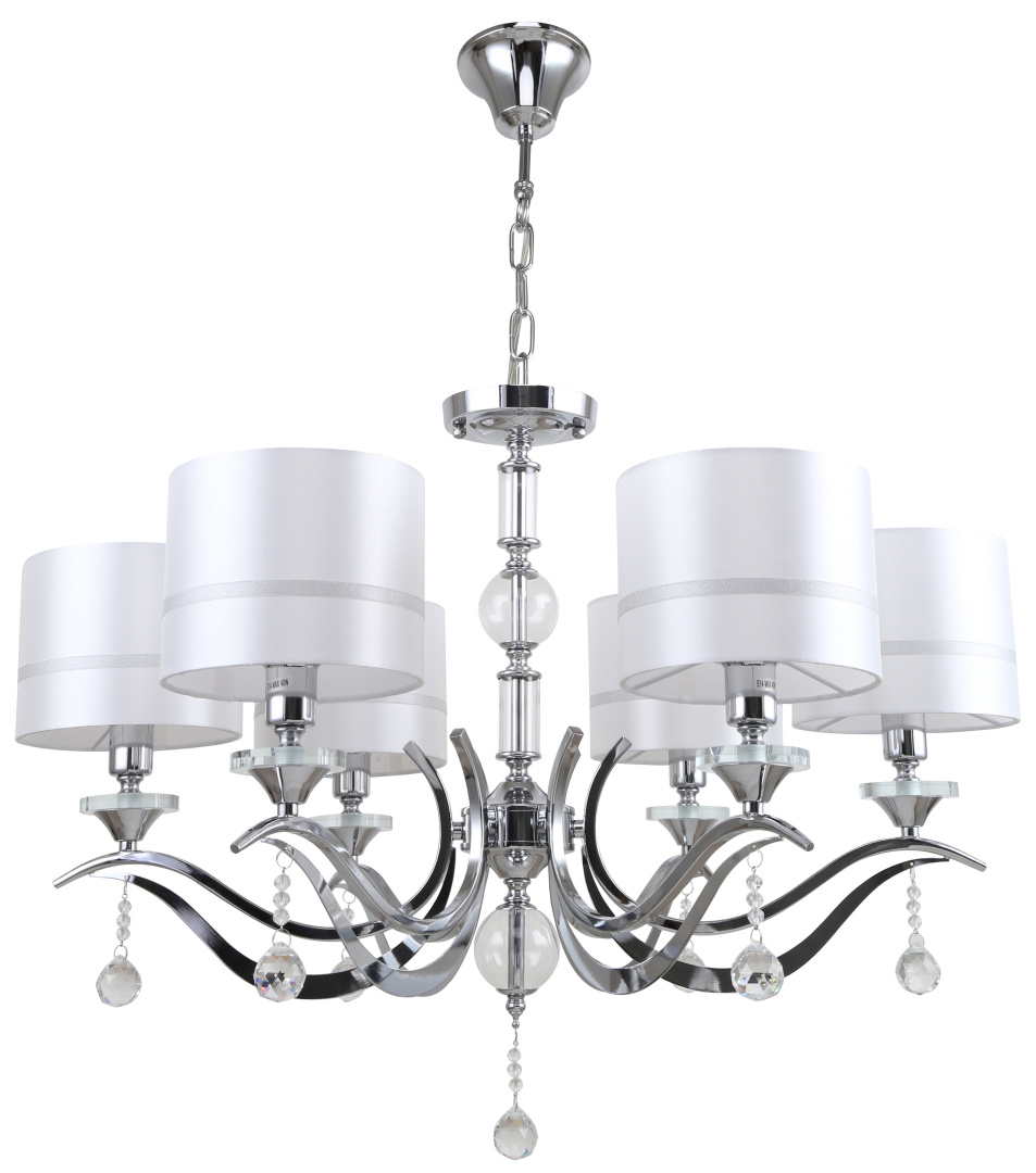 Люстра подвесная из коллекции Flippe выполнена из металла, гальванизированного в цвет хрома. Люстра декорирована прозрачным хрусталем в форме шара и декоративными розетками из прозрачного стекла. Источники света закрыты белыми текстильными абажурами с термостойким акрилом внутри. Абажуры отделаны серым кантом.