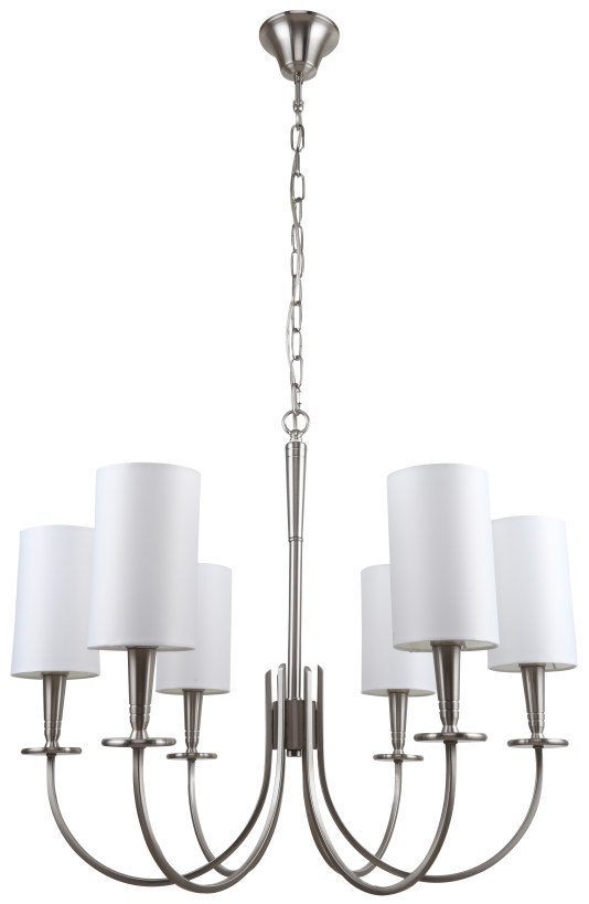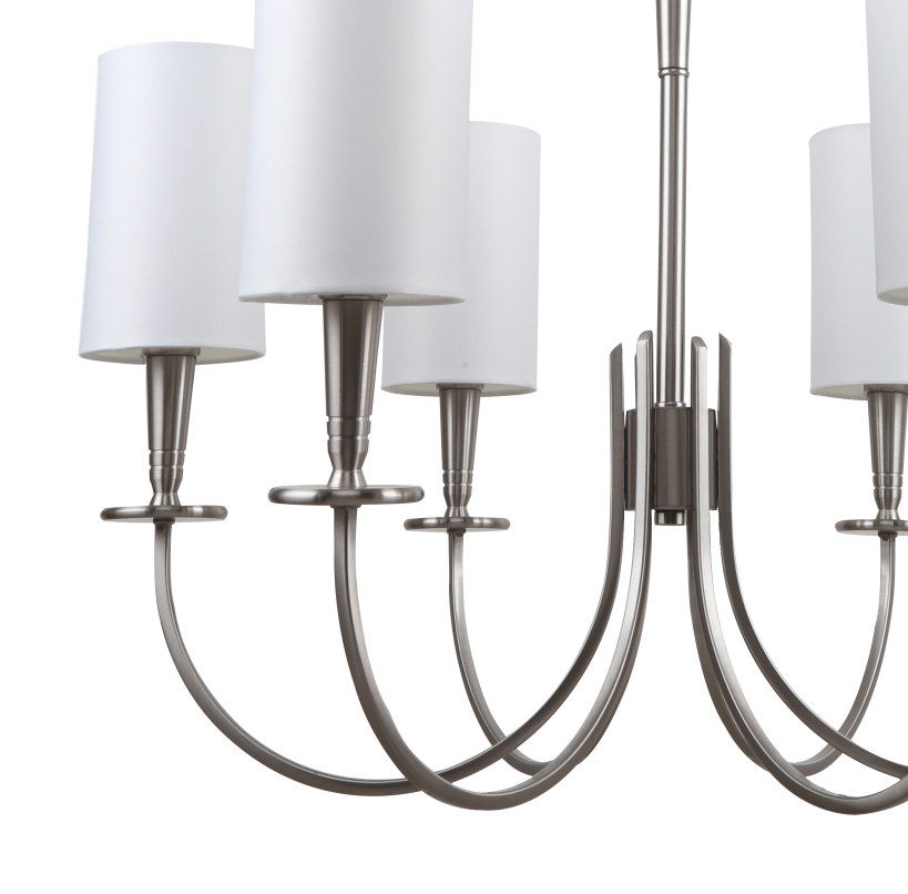 Люстра подвесная из коллекции Flokky выполнена из металла, гальванизированного в цвет никеля, и декорирована вытянутыми текстильными абажурами белого цвета с термостойким акрилом внутри.